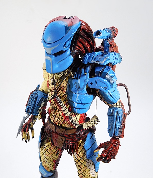 Lasershot comes with a bio-mask that can be worn over his head. It’s vaguely like your average Pred mask, but it has a lot more panel lines sculpted into it. The upper right side is also missing to accommodate his facial grafts. The bio mask is painted with a copper finish, which puts it at odds with the golden armor, but it still looks pretty good on him. Although, to be honest, I think I prefer him without the mask. NECA did too fine a job with that head sculpt for me to be covering it up.