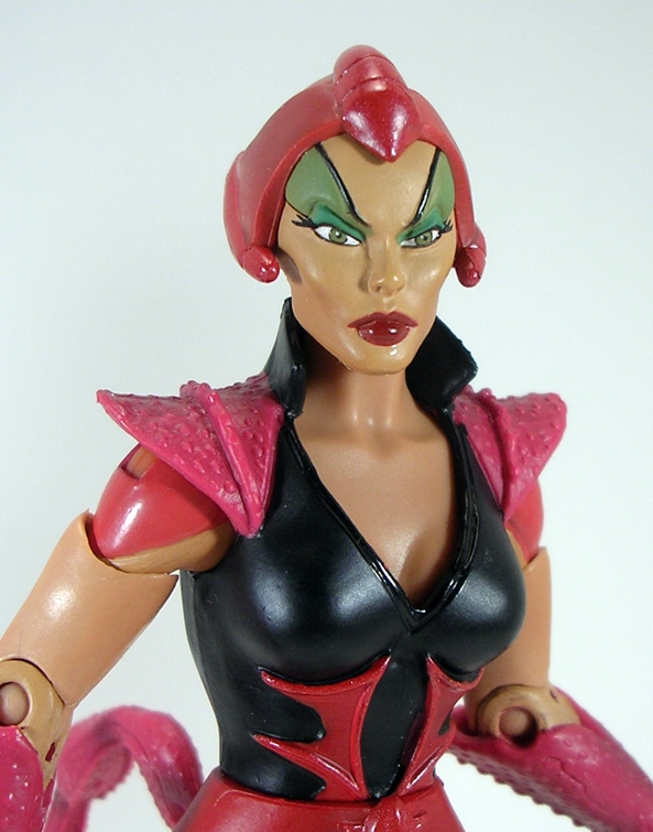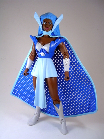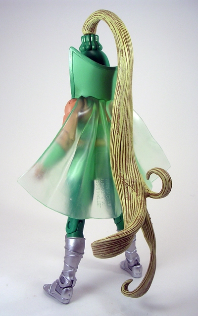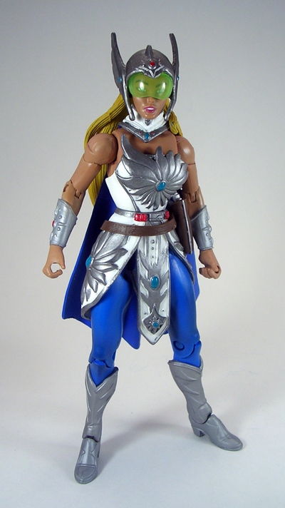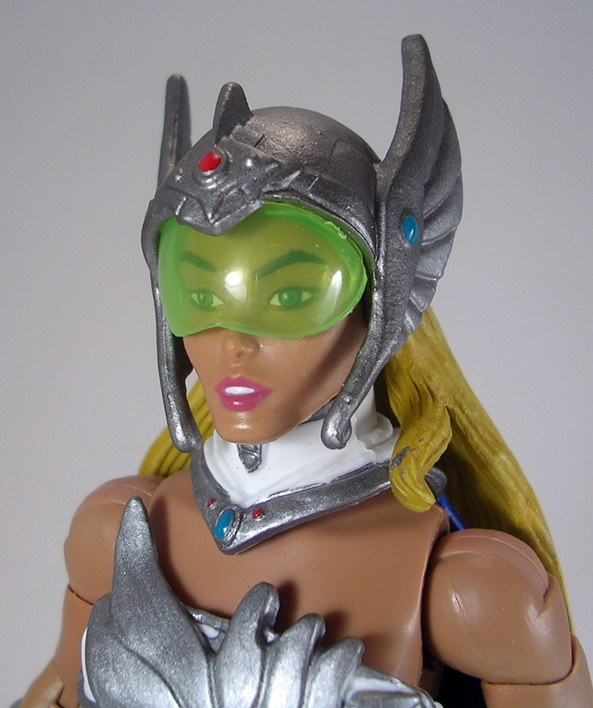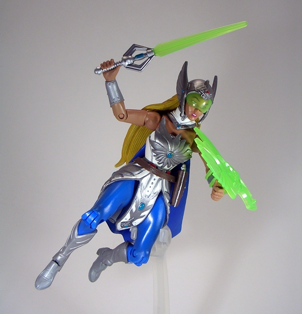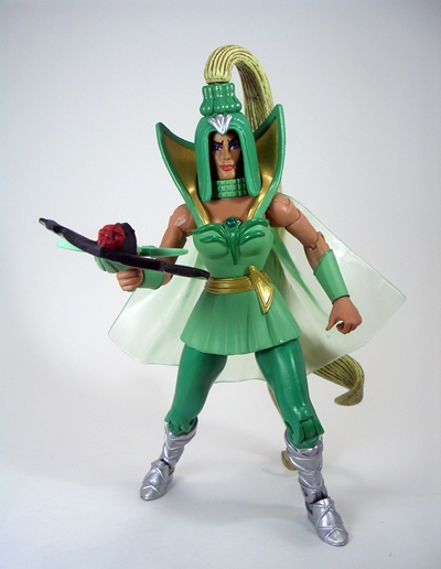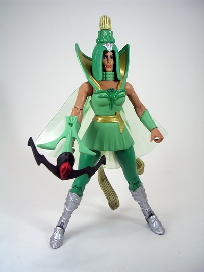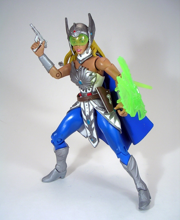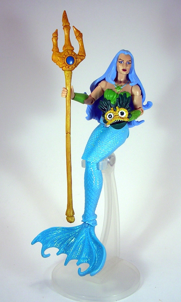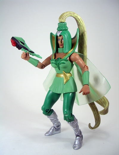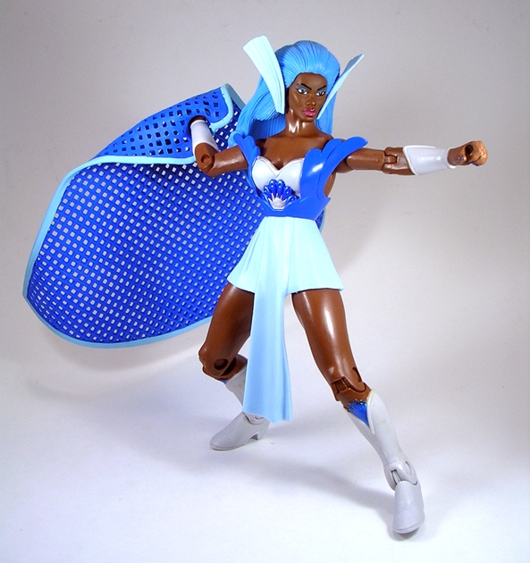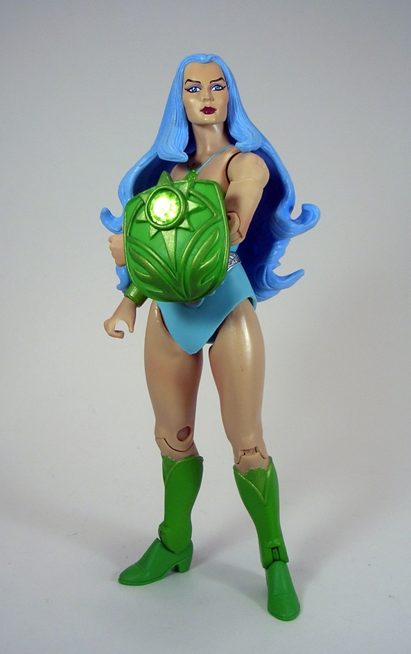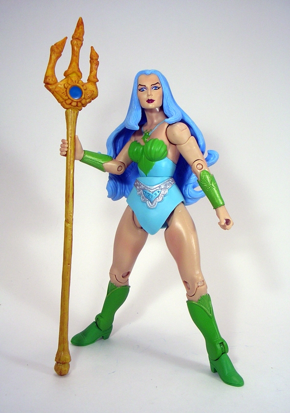But Mermista’s got legs and she knows how to use them! That’s a little ZZ Top for you younger folk! To swap the tail you just pull her apart, the break is at the waist, in a fashion similar to King Hsss and then pop on the set of legs. In humanoid form, Mermista sports a pair of green boots and arm bracers, and a rather short blue skirt with an ornately sculpted silver belt. She has a green top with a pair of stereotypical clamshells for her booberz and the magical necklace spoken about in her bio is sculpted right onto her neck. All in all, her humanoid costume is rather simple and understated but I like it a lot.