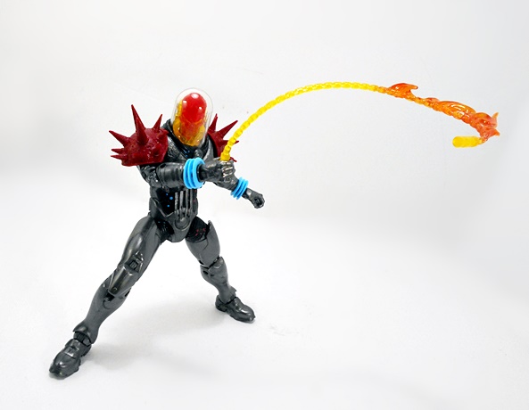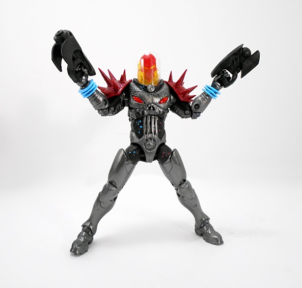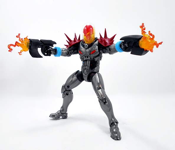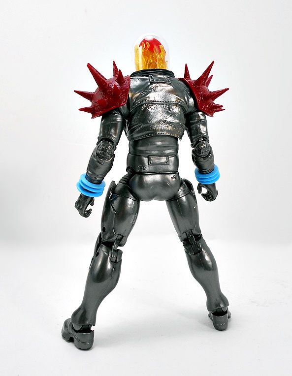 And that brings us to the motorcycle! Now, as I mentioned earlier, I’ve skipped a few of the previous motorcycle releases, particularly the one with Wolverine, so I’m not sure if this is new or a repack, but either way it’s a great looking bike! If you’re looking for flashy colors and lots of paint applications, look elsewhere, because this thing is blacker than the dark pit where the last vestiges of Frank Castle’s mercy hides. There are, however, a few minor flourishes of red, as well as a customized license plate, which reads PNSH-616. It makes me laugh to think Castle actually went into the New York City DMV and applied for that plate. The clear plastic headlamp on the front looks great and there’s a small Punisher emblem in the speedometer, personalizing the middle of the handlebars. There’s plenty of detail in the engine, the wheels roll well, and thanks to the flip down kickstand, Castle can be displayed riding it without worrying about it toppling over. What’s more he fits on it perfectly and his gun hands grip the handlebars and stay put. I think my only nitpick here is I would have liked a bracket or scabbard for him to be able to store some of his weapons.