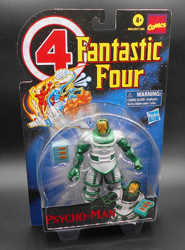 Oh, I do love me this packaging! You get the beautiful Fantastic Four logo at the top with the team depicted just below the 4. The large bubble showcases the figure and also has some personalized character art at the bottom of the bubble. The card is made of decently hefty stock, so as not to easily bend or tear, making them perfect for mint-on-card collectors. I got this set from Amazon and even with their firm belief in using zero packing materials whenever possible, they arrived in great shape. The cards also featire both a J-hook and a balanced bottom surface, so these beauties are at home either hanging on the wall or standing on a shelf. Let’s start with Psycho-Man!