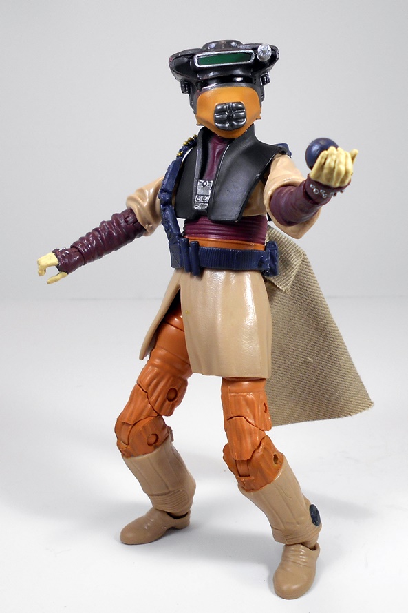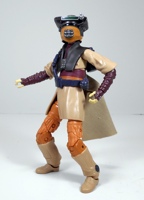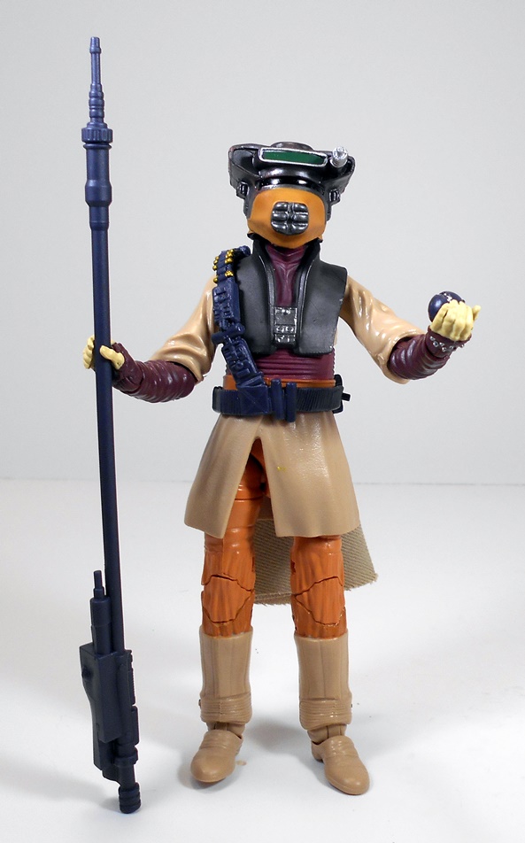 This figure was part of Hasbro’s woefully disappointing 40th Anniversary offerings for Return of the Jedi, which featured just a few new figures and a whole bunch of repacks on vintage style cards. And much to my amazement, not a single one of Jabba’s Skiff Guards among them. I think the figures look great on the oversized vintage-style cards, but Amazon mangled both of mine pretty badly. Not a problem, since I always planned on opening them anyway. I’d say it’s about a 50-50 chance as to whether or not I get a carded figure from Amazon in good shape or not, and I always take that into account when buying from them. Anyway, the card has the familiar photo of the Rebel Commando crouched and ready for action beside the Imperial Bunker and the back of the card has the usual cross-sell promotion showing other figures in the assortment.