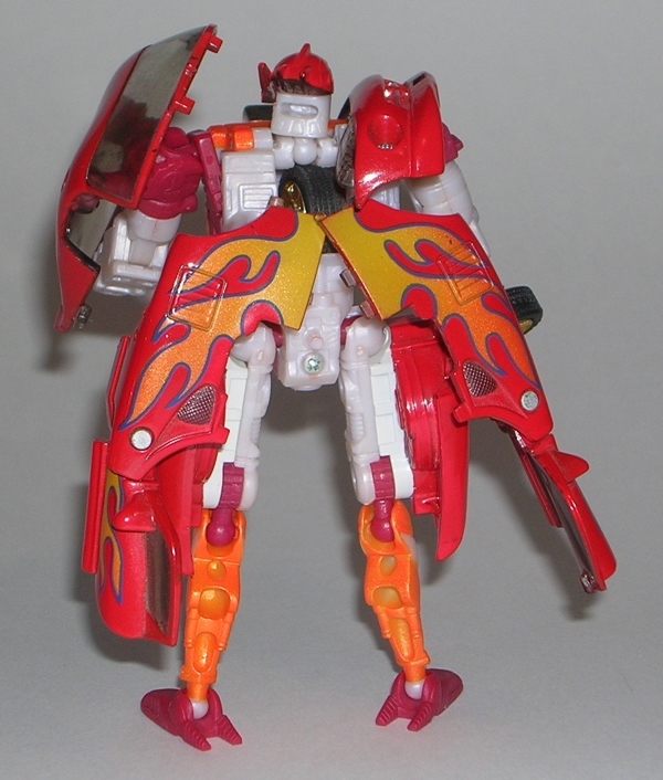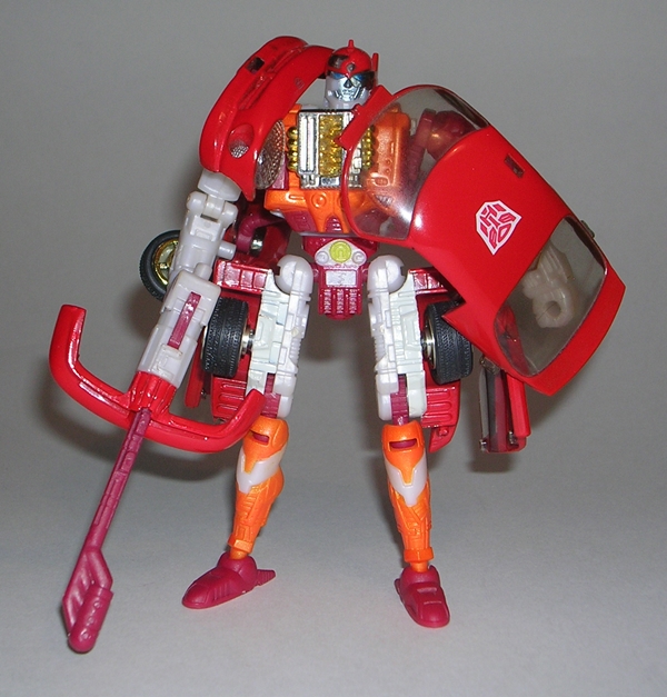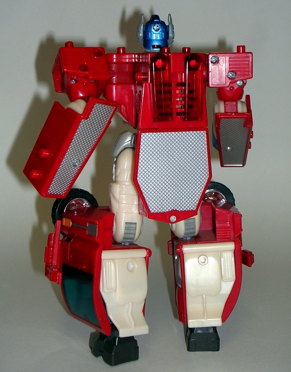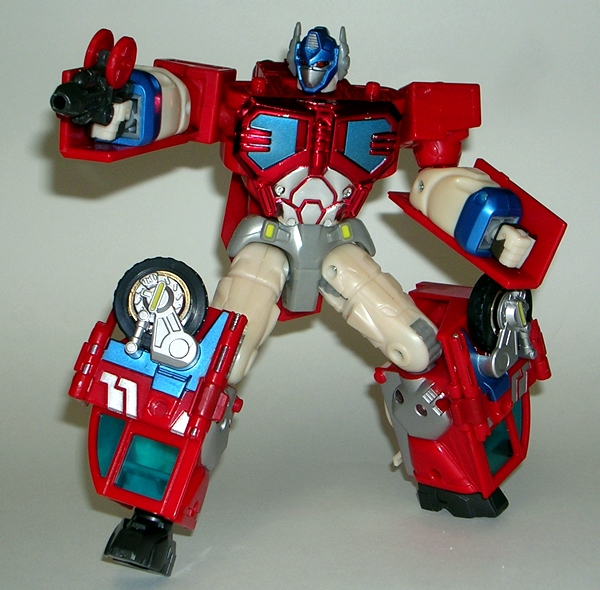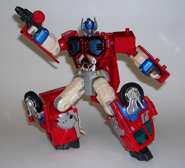 Transforming Prime is similar to a lot of Optimus toys in that you detach his trailer, or in this case the bulk of the fire truck, and just transform the cab. What you come away with is pretty unique in that most of his robot mode is rolled up into the shell of the cab. Prime features very organic looking legs and arms with some more boxy and angular bits for his lower legs and shoulders. His chest plate is vac metal plated, and while mine has a few little chips here and there, I think it has held up pretty well. The head sculpt is certainly influenced by the Prime I know and love, but it’s extremely stylized and one that I could never really get behind.