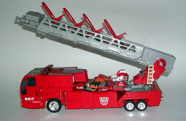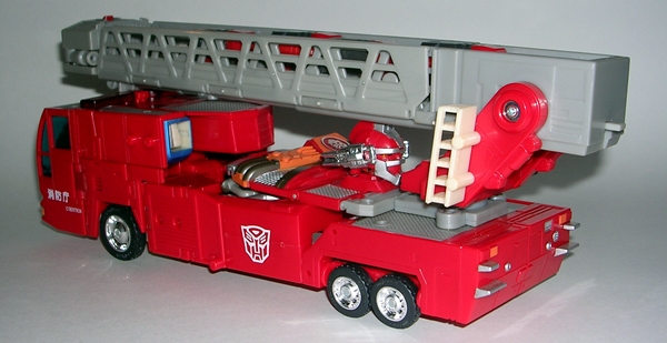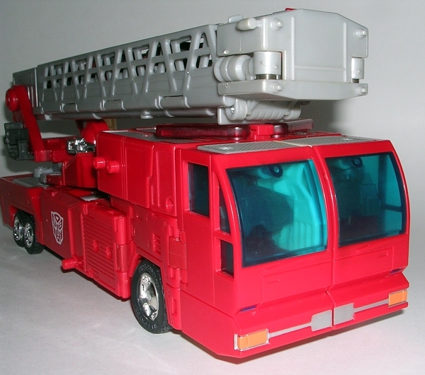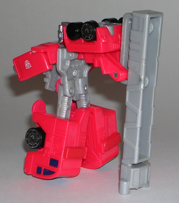 So, here’s Prime as a fire truck. I love the concept because fire trucks have always been innately heroic symbols to me. They represent courage and self-sacrifice, so a fire truck is a no brainer for a Prime alt mode. This is a great looking toy, with lots of attention to detail that gives it a nice sense of realism. You get big clear blue windshields, chrome wheels with real rubber tires, and big Autobot symbols on each side. Nice little touches also include the little ladder on the side and the seat where the ladder operator would sit. Sure, you can see one of Prime’s heads under the ladder, but that’s no big deal for me. Yup, he’s a great looking toy, but as soon as you pick it up, it’s going to fall apart, so it’s best not to handle it too much. It’s just one of the things about this guy that probably makes him better as a collector piece than an actual toy.