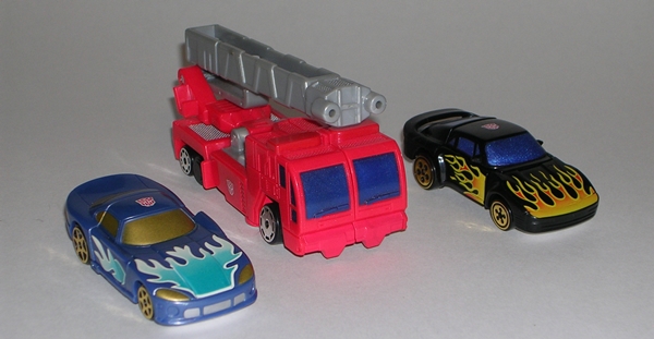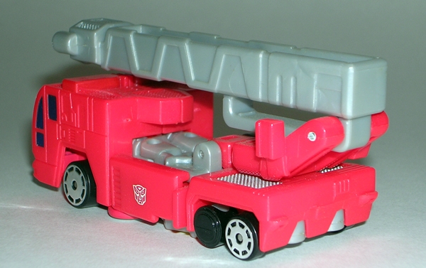Besides rolling along, Prime has some play features. He has electronic lights and sounds, but I’ve never put batteries in him to test it out. That’s probably a good thing, because if I had, the toy would probably have been ruined with battery goo by now. His ladder can elevate and turn and it also packs a couple cool surprises. Push the button at the front and two water cannons pop out of the front. Push the button on the back of the ladder and four missile launchers snap up and are ready to fire. I was amazed to find that I still had all the missiles!
