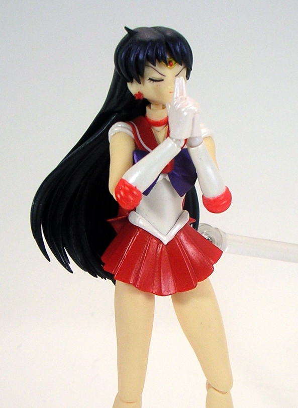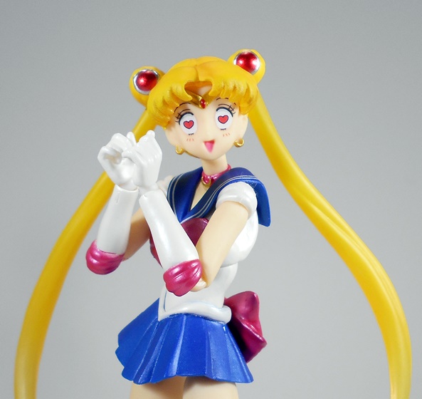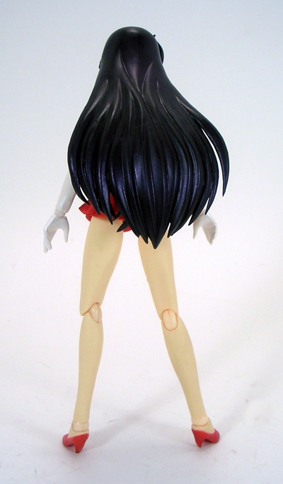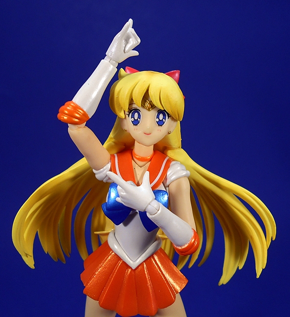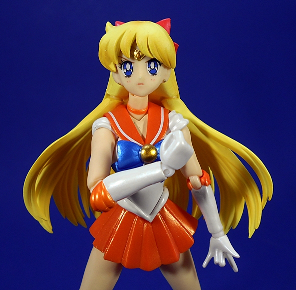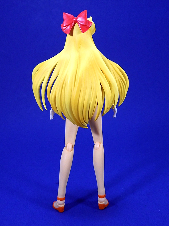 Venus’ outfit is basically just a direct repaint of Sailor Moon’s, with the exception of her wearing shoes instead of boots. As a result, this is a pretty familiar figure to anyone who already owns Usagi, and even more so to those like me who saved Minako for last. The skirt and collar are painted with a very attractive metallic orange, as well as her shoes and the fringe on her gloves. The bow on her front is blue with a gold button and the rest of the outfit is the same pearlescent white that we’ve been seeing all along. Paint quality is generally not an issue with these figures and in keeping with tradition the paint here is exceptionally good and probably among the best out of all of my Scouts. I initially thought that Venus’ head sat unusually high on the neck, but it turns out I didn’t have it pushed all the way in for some of these shots. D’oh!