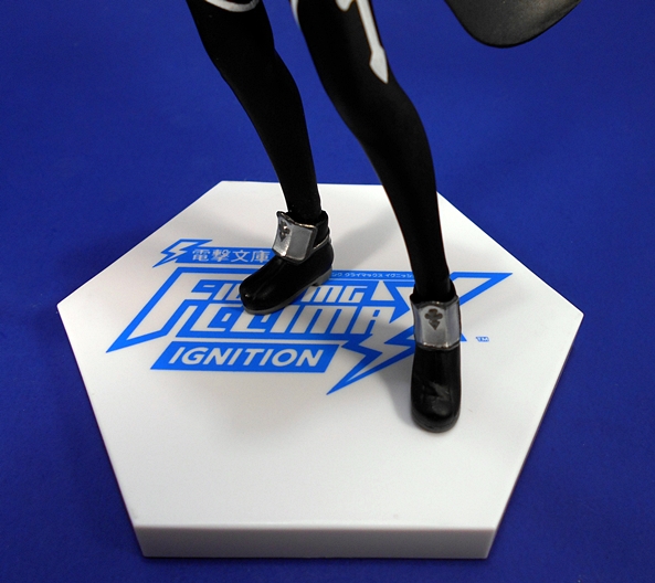 Here’s Mutsu all set up and looking great. It’s a playful and demure pose and it almost looks like she’s blowing a kiss. I think this pose works great when the figure is on its own and without all the gear. It also nicely reflects Mutsu’s flirty and seldom too serious personality. Otherwise, she wears an outfit that’s very similar to Nagato’s, which includes a black and white half-top and a very short black pleated skirt with white stripe around the bottom. The outfit is rounded out by white gloves and a pair of knee-high red and gray rudder boots with white striping at the tops. One thing of note is that the arming belt she’s displayed with here does not have the ports to attach her armaments. I’m guessing they did that to give her more of a streamlined look for people who wanted to display her without her gear. I think it was a good choice!