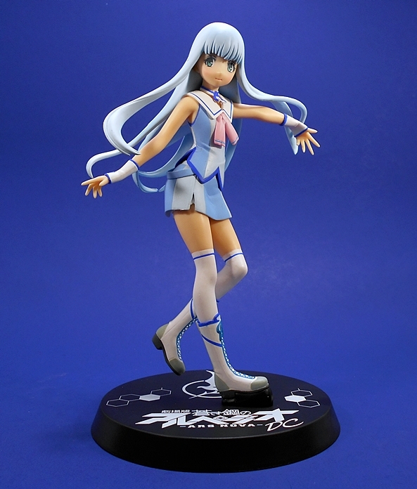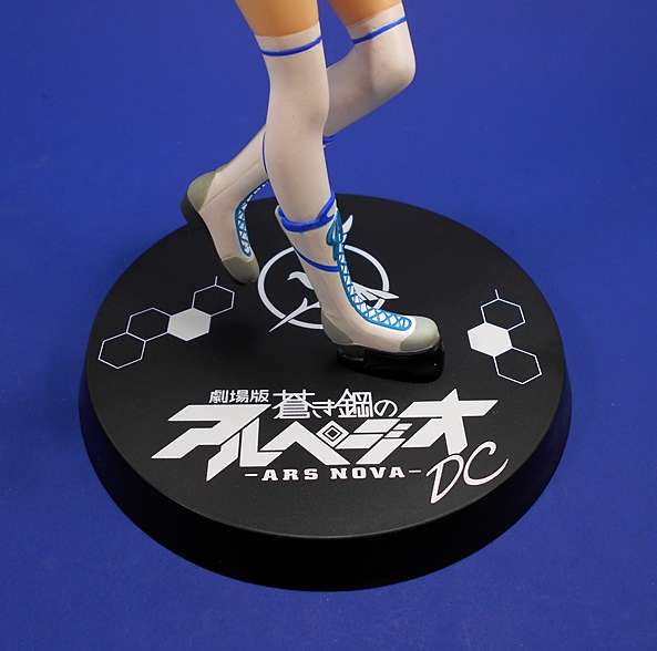 I like the base a lot. It consists of a raised black disc with white printing, which includes the fleet insignia, some hexagons and the title of the anime with “Ars Nova DC” in English.