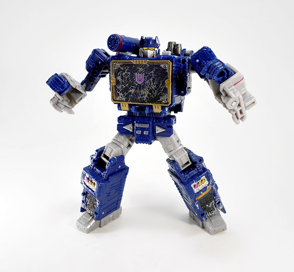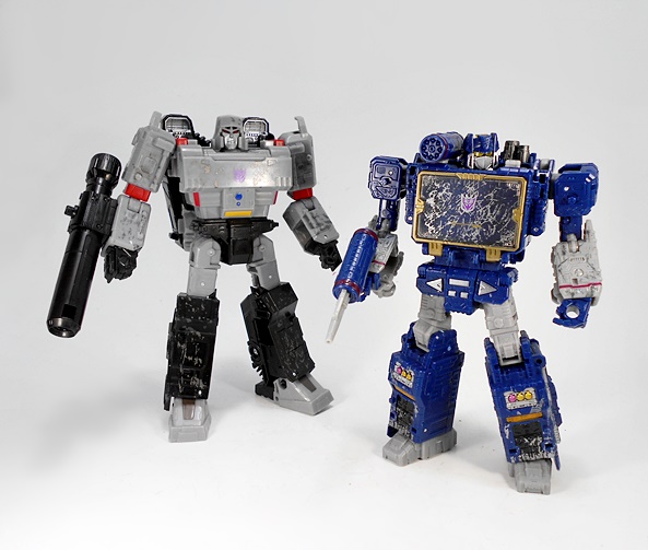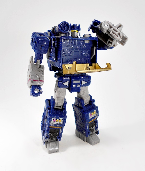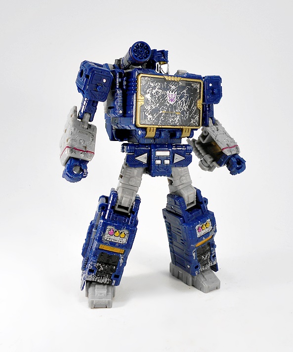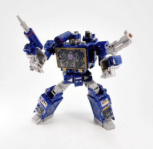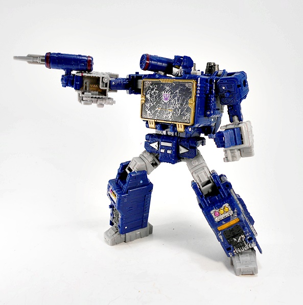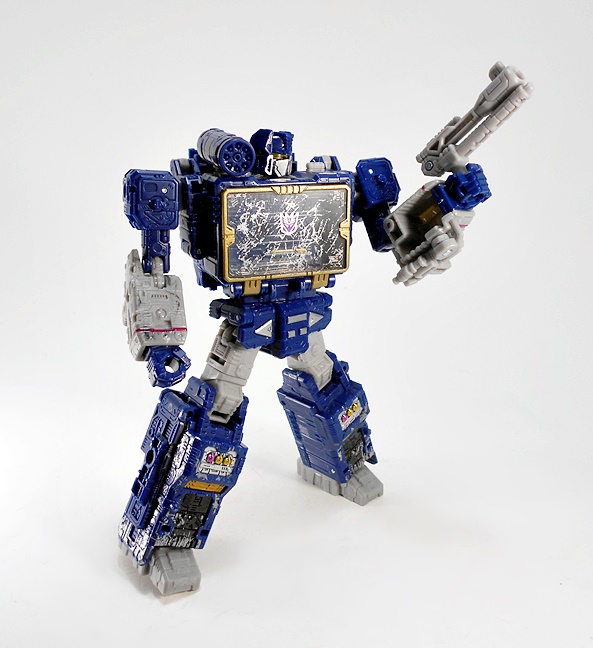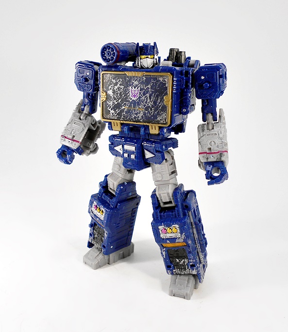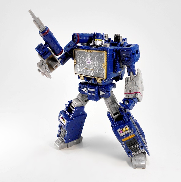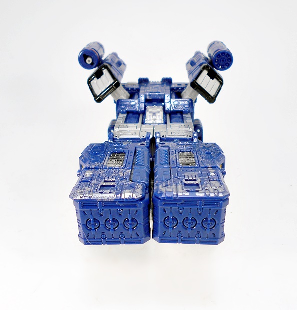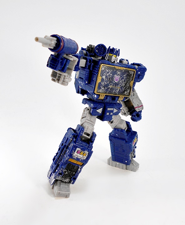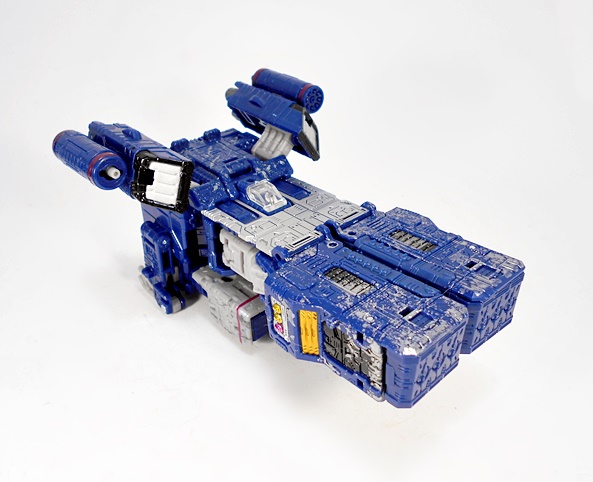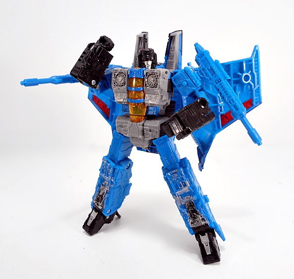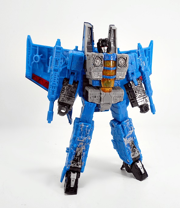 In robot mode, Thundercracker’s color scheme holds no surprises. He’s still mostly blue with some black trim and bare gray plastic making up the frame of his torso. The weathering here is all silver and he’s got a lot of it on his lower legs. I like to think that’s just Autobot blood that’s splashed all over him while he was kicking the shit out of one of them. Yeah, that got dark! G1 Thundercracker was the first Decepticon jet I owned as a kid, and the only one I had for a long while, so while his deco is probably the more boring of the three, he’ll always have a special place in my heart. So, other than the fact that this figure looks great, is there anything else to say?