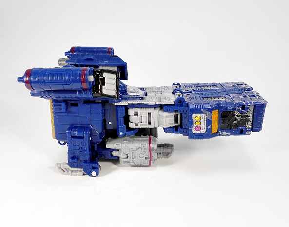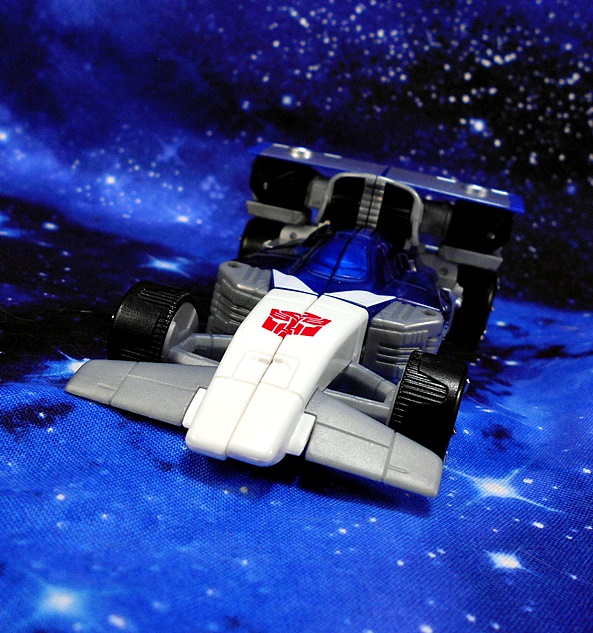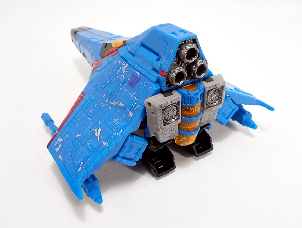 This is not a dead ringer for the Sunbow Tetrajet design and I’m not faulting Hasbro for that, because of the clear challenge that stems from working with the design. As we will soon see Hasbro clearly made some sacrifices to the jet mode to preserve the robot mode. Still, I’d say that this captures the spirit of that original Tetra Jet , and it’s likely as close as we’re going to get without interjecting insane Masterpiece levels of panel-shifting transformations. This design de-emphasizes equality of the jet’s four points by diminishing the wings and extending the snout, for lack of a better term. The result is something that evokes the basic design of the Colonial Viper from Battlestar Galactica more than the original Tetra Jet, especially with the three thrusters in the back, but I still dig it. It totally works for me as a Cybertron design in that it’s different enough to look like an alien vehicle, and yet it’s still similar to the Earth design that the Seekers later adopted.