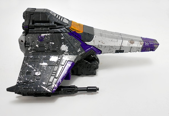On the downside, this alt mode is almost as much kibble as it is jet, with the bulk of the robot body hanging out in the undercarriage and the chest piece rather awkwardly on display from the back. The undercarriage junk doesn’t bother me so much. To be fair, the down-swept wings do conceal some of it and it does provide a nice platform for the jet to rest on. And because this is an alien design, who’s to say that’s not what it’s supposed to look like. Besides, Primus knows we’ve had plenty of regular jet modes over the years with as much robot undercarriage as these toys. But as much as I’ll defend that stuff, the chest piece on the back bugs me a lot, just because it’s so painfully obvious what it is, I’ve tried to tell myself that the two intake fans don’t look out of place there, and that the faked out cockpit could be some kind of generator, but it’s just impossible for me not see it for what it really is. Starscream also has a pair of guns that peg in under his wings.