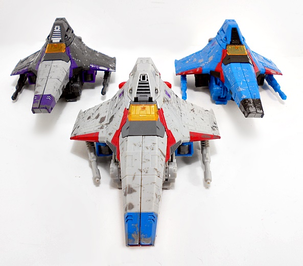 Skywarp adds the most color to the mix, making his deco a little atypical. His wing. Rather than being mostly black, it’s reserved for his wing area, with the snout of the jet being painted silver and the tip purple. You get more purple trim on the wings and around the sides near the yellow canopy, and more silver in the grills. It’s a striking deco that looks amazing, even if I’m used to seeing more black in my Skywarps. Like Thundercracker, SKywarp has a bunch of silver painted abrasions and wear, showing that he’s seen some action in his day.