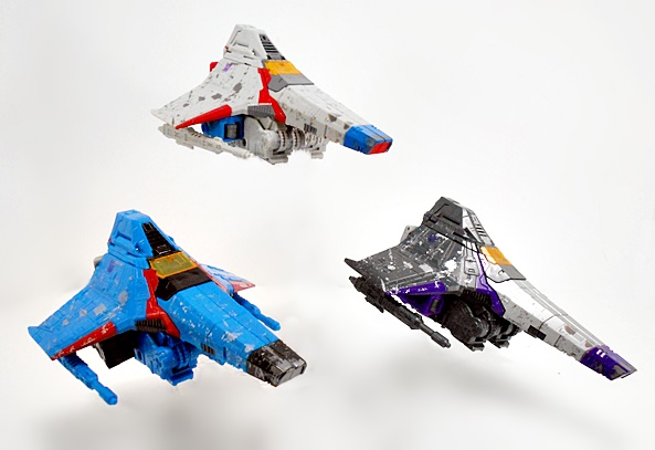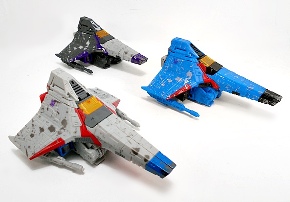 And just to complicate things, the packaging and distribution of these figures varied. Starscream and Thundercracker were regular Voyager Class releases and as such they come in typical Siege style packaging. As always, these boxes look great, feature some amazing artwork and allow you to get a good look at the figure in robot mode before opening. Much to the chagrin of some collectors, Skywarp was offered later as an exclusive and has since been a bit tough to get a hold of at a reasonable price. He was also packaged differently, this time in boxed set called The Phantomstrike Squadron, and came with three little Weapon Masters figures. All three of the Seekers feature the exact same mold, except for some variations in the head, so let’s just take a look at Starscream’s alt mode first and then check out the different decos found on his comrades.