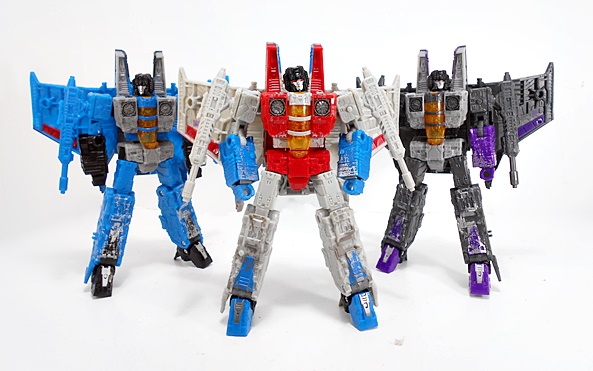 Transforming these guys isn’t too bad, and there’s actually some pretty clever stuff going on, like the way the nose of the jet splits to become the familiar shoulder intakes. Indeed, the only gripe I have about the transformation is that the friction hinges that hold the chest piece on isn’t up to the task and I’ve yet to be able to transform Starscream without it falling off. The others are a little better, but it still probably pops off at least half of the time. Once transformed we get a very familiar G1 Seeker robot mode, which makes me appreciate the alt mode a lot more. I’m just all kinds of impressed they were able to get this robot mode out of that Tetra Jet. The proportions are great and even the articulation is solid and fun. Sure, we already know the cockpit chest is a feake-out, but I don’t have a problem with that. Indeed, my only real complaint here is that the unfinished side of the wings face forward, but Hasbro even tried to pretty them up by stamping Decepticon insignia on them and giving them a little painted trim. From behind he’s mostly a wall of wings, but a nicely finished one. Even his lower legs fill in!