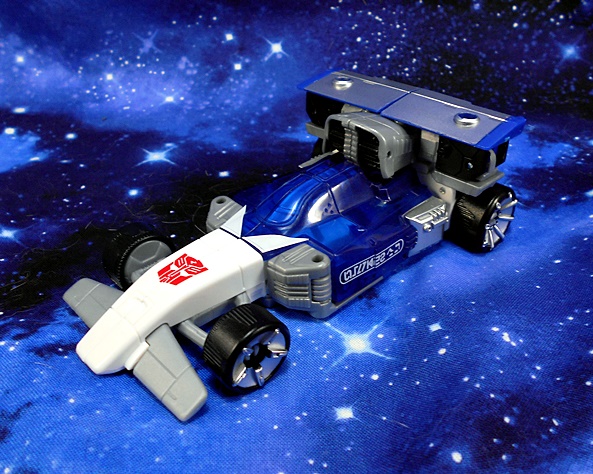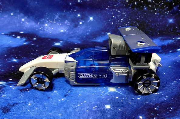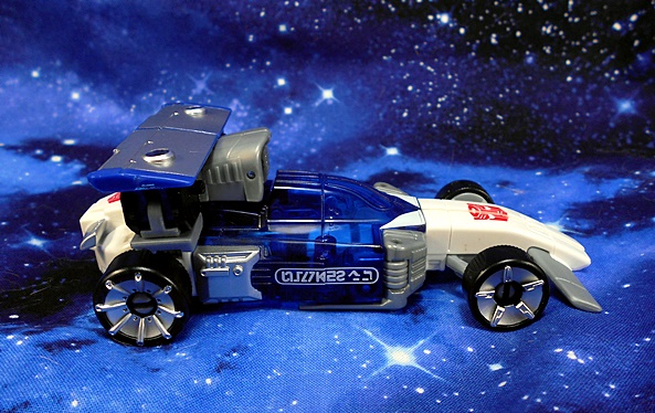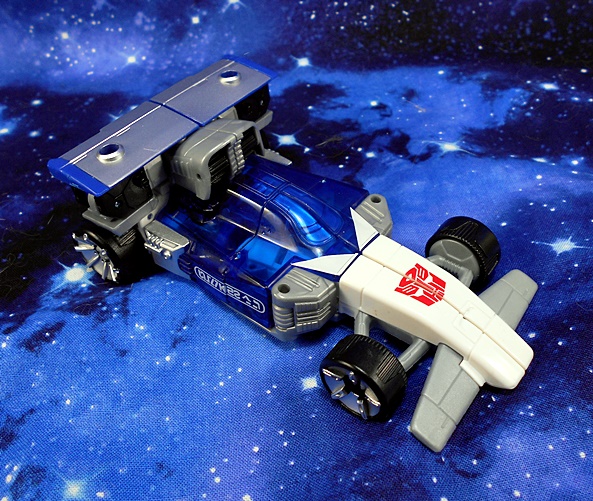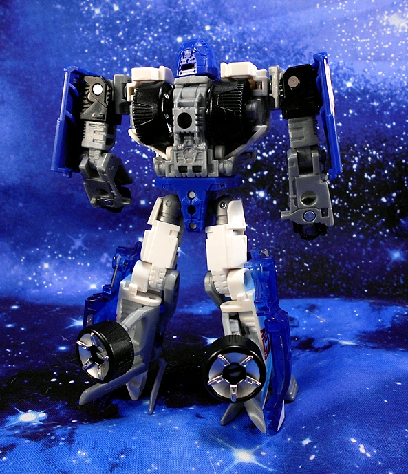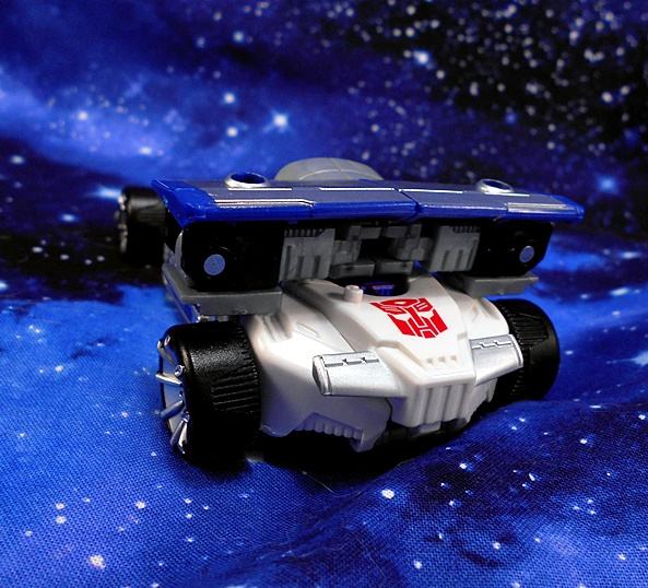 The portrait is superb. I love the detail work that went into the “helmet,” the flashy silver paint used for the face, and the glaring red light-piping in the eyes. And once again, I have to call out how amazing all the panel lines are in the mold itself. Even the transparent cockpit in the chest features etched circuit-like patterns, and is flanked by those awesome looking fans. I also really dig how he’s got thrusters emerging from the middle of his feet, even though these aren’t really part of his Tetra Jet mode.