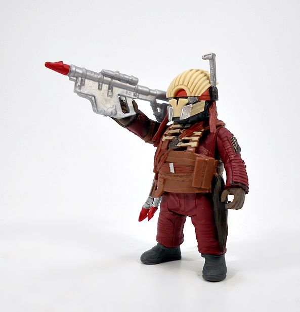 The extra uniform pieces consist of a cape, a helmet, goggles, and a breather mask. The cape features some particularly great sculpting and weathering, and I like that it’s not too cumbersome, because even as it is, it seems like the most impractical thing to include on an infantry uniform. [OK, that was only true until I realized it’s probably a rain poncho and not a cape.] It’s designed to tab into two notches on his shoulders, but mine doesn’t like to do that, which isn’t a big problem because it stays on just fine by hugging his shoulders.