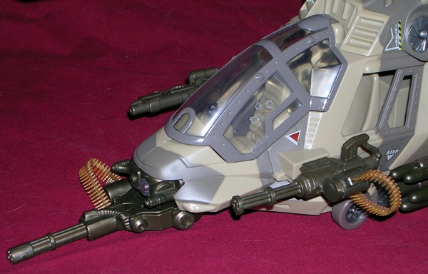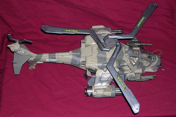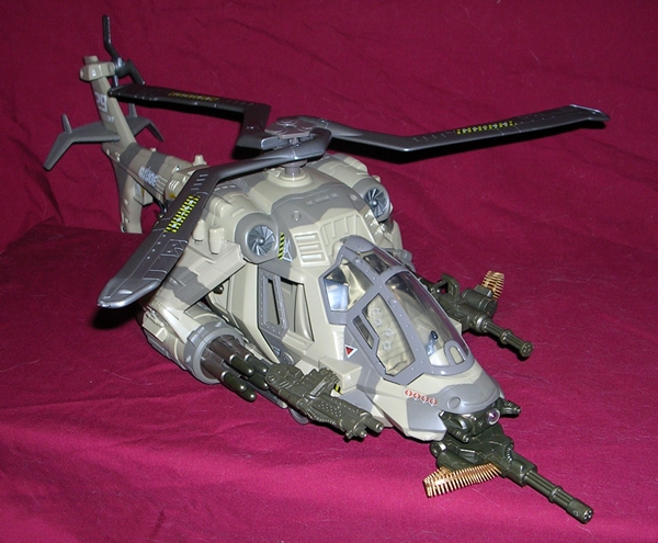 The NAC Chopper was released as part of the Spytroops line. I believe the original version was done in jungle camo and that this desert camo repaint came along the following year. I stumbled upon it back in my toy hunting days at a KB Toys Outlet (oh, those were the days!) and to be honest, I wasn’t enamored with it at first. I thought the crooked chopper blades made it look goofy, but I couldn’t deny it was a beefy and impressive toy. It was also on deep clearance so I couldn’t resist taking it home with me. The packaging is long gone, but it’s worth noting that Spytroops was a dark time when Hasbro packaged most of the vehicles in open air boxes, which meant kids could come along and stick boogers and gum onto the toy before you could even buy it. It wasn’t uncommon to have to go through several toys on the shelf before you found one that some kids didn’t already break or mess up.