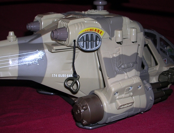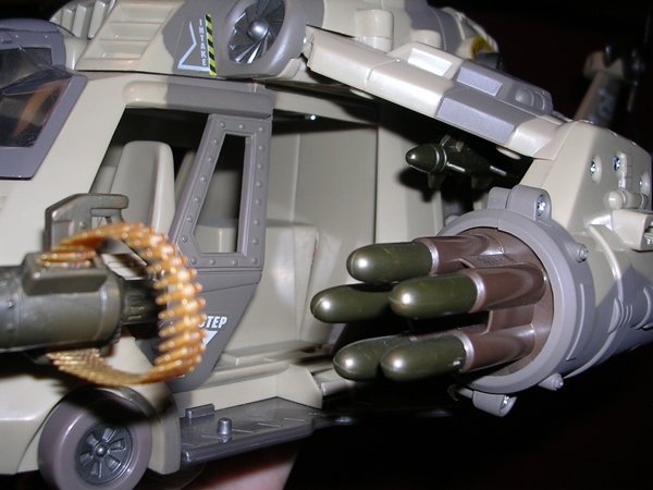 The stylized chopper blades still irk me, but considering that the rest of the toy is this glorious, I’ve learned to look past them. This is a beast of a toy and absolutely loaded with electronics and play value. There’s a fold down pistol grip on the bottom, which makes it easy to fly through the house and there’s a trigger on the tail boom to make the blades spin. You also get a winch on the side to lower Joes into action. The tan deco is simple but effective and the chopper comes with the stickers pre-applied. I love the stickers on this thing. Besides the usual registry numbers and the GI Joe logo, you get all sorts of hazard stripes, weapon load indicators; bullet holes in the canopy and even Cobra kill marks near the cockpit. Brillaint!