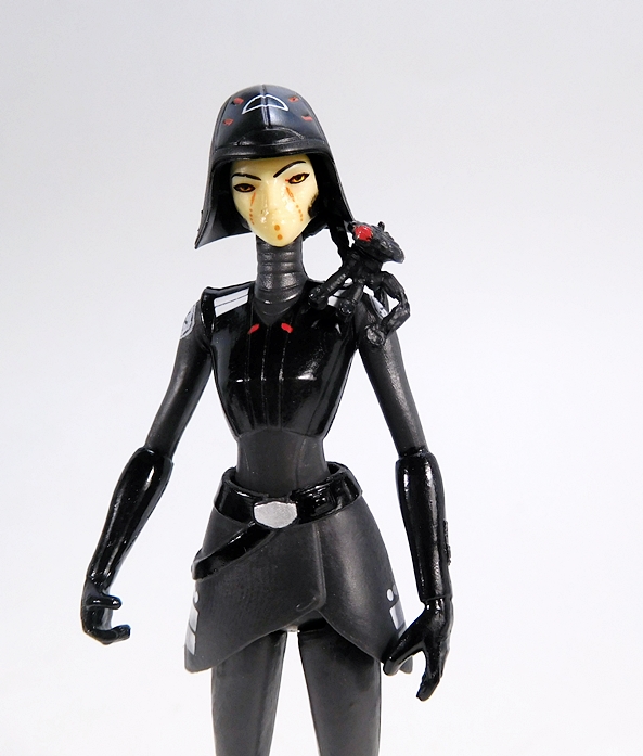 The new helmet instantly reminds me of some of the Imperial pilot helmets, like the TIE Pilot or the AT-AT Driver. It still retains a lot of the regular Stormtrooper helmet features, but here the eyes are a continuous visor, the breather tubes protrude from the front, and there’s a crest running up the top of the helmet. The side vents are neatly painted blue, and you get some gray and orange paint on the top. It’s a pretty cool variant that incorporates a number of different Imperial design tropes.