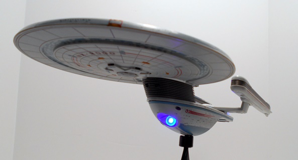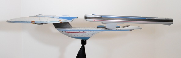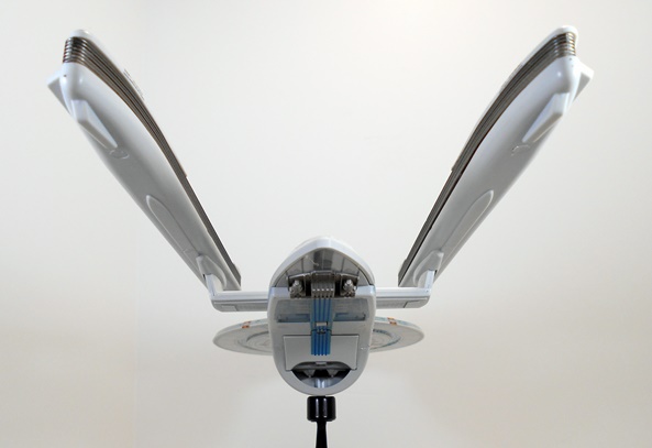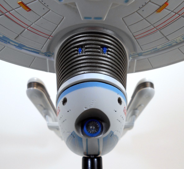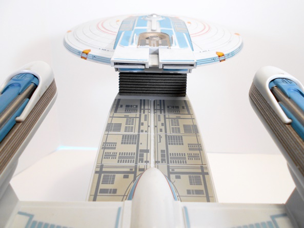 The package is exactly what we’ve been seeing all along. You get an elongated blue window box with the classic “Star Trek” logo and a bunch of text about the ship. There’s a “Try Me” window that lets you get a taste of the electronics. The ship comes fully assembled, all you have to do is put together the two halves of the stand and plug the ball into the socket under the ship. You will need a phillips head screwdriver to undo the battery hatch and switch it from “Try Me” to “Play” in order to get the full effect, but unless this is your first DST Starship, you’ve probably been through all this before. Also included in the box is a replacement battery hatch without the socket for the stand and a folded instruction sheet. With the ship measuring just over 18-inches from the tip of the saucer to the back of the nacelles, it’s every bit as long as The Excelsior, but the design makes it look a lot slighter in every other respect.