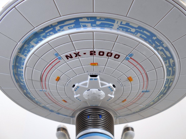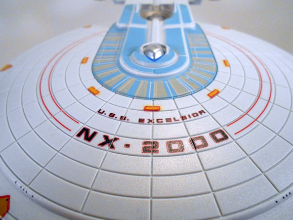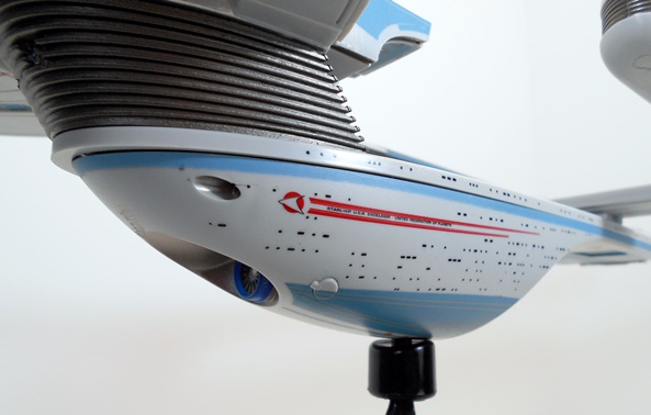 This ship uses a pearlescent plastic, which is somewhat similar to the stuff used for my “Wrath of Khan” Enterprise. While it’s not nearly as light and overall looks much better here, it still allows for some light bleed, which I’ll get to in a just a bit. I do, however, still prefer the denser stuff used for the hulls of the Excelsior and the Enterprise-D. The ship also uses several decals for the registry numbers and “racing” stripes. These are all applied with care and look straight and sharp.