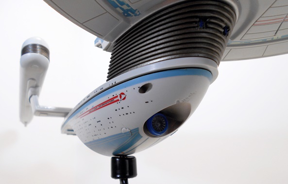 The paintwork compliments the sculpted detail wonderfully. Every window is painted onto the ship’s skin from the random windows of crew quarters to the line of panels that runs across the wall of the Conference Room and even the viewports of Ten Forward. The Escape Pod hatches are painted tan and you’ve got a darker grey on the Shuttle Bay doors and the Phaser Array strips. The lettering is all crisp and hugs the hull better than what I remember seeing in the test shots. Of all the tiny details, I think the one that impresses me the most are the tiny scoring lines that run along the perimeter of all the Phaser Arrays. Holy shit that’s cool!