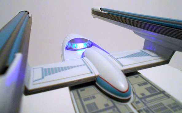The electronics feature the usual mix of lights and sound. There are lights in the primary hull, which light up bridge and the windows near by as well as the two red impulse engines. This point features a fair amount of light bleeding, which is obvious, but look enough like spot lights on the exterior that I don’t mind it so much. The deflector dish lights up a very bright yellow with virtually no light bleeding at all. Lastly, the bussard collectors on the warp nacelles light up red and the top strips light up blue. Again, you get some light bleeding on the nacelles, mostly around the seams below the red bussard collectors, but the blue nacelle strips look really sharp.The lights only activate when the sound effects are going off and sadly there’s no function to just run the lights. As for the sound effects, here they are…