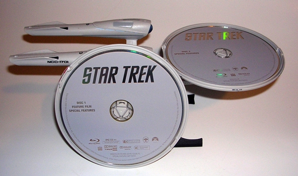 I do, however, really enjoy the Star Trek package, which is basically a little model of the Enterprise with the discs cleverly held in the saucer section. It’s such an amazingly well-crafted little piece that owning it dissuaded me from spending the money on Playmates version of the 2009 Enterprise. No, it’s not electronic, but it displays just as well on the shelf. It doesn’t look like a Blu-Ray incentive at all. It just looks like a little model of the Enterprise that I would have on my shelf.