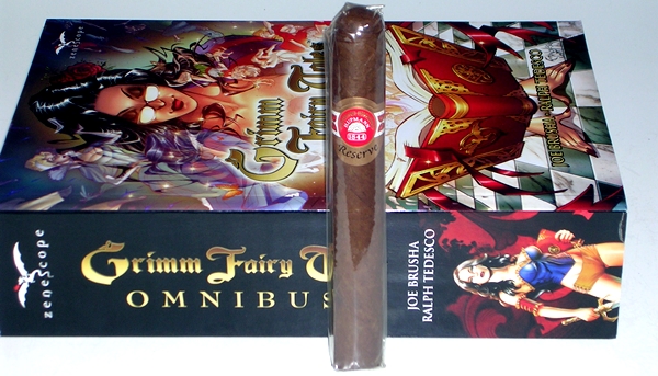 Arriving just in time for the waning days of my vacation, Zenescope has finally released their mammoth Omnibus collection of their always twisted and sometimes sexy take on Grimm’s Fairy Tales. It’s actually been available for a little while as an exclusive from their booth at various conventions. Unfortunately, I live toward the tip of a peninsula where such conventions are mostly fairy tales themselves. See what I did there? If you haven’t delved into any of the 80+ issues of GFT and its rapidly expanding universe, here’s the deal: In what usually plays out like an after-hours Twilight Zone episode, characters are beaten over the head with moral lessons played out in Fairy Tales that usually draw to a delightfully gore-filled conclusion. Needless to say I’m spending a lot of time with this book this weekend and my cigar of choice this time is the always faithful, H. Upmann 1844 Special Reserve. Mmm… lovely.
