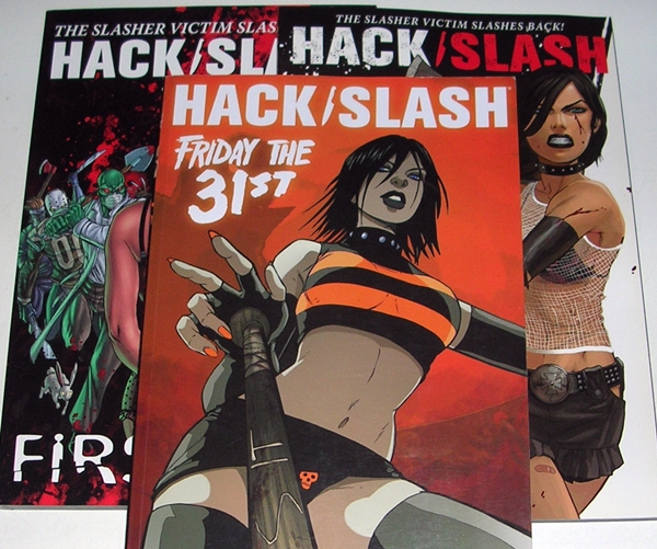 Nope, I just wanted to give a shout out to the Ebay Seller Rivalrycomics, because they’re so professional and awesome. I bought Hack/Slash Vol. 3 from them and they quickly messaged me to let me know that it had some light shelf wear and a bumped corner and apologized and said if I wanted to cancel the order or take a discount they’d be fine with that. I know where they’re coming from. I owned and operated a book shop for eight years. I did a lot of Internet business, and I know how hard it is to accurately represent collectibles when it comes to condition. Collectors can be crazy picky!