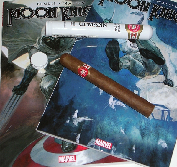 Tomorrow starts my vacation in which I will embark on a great quest to see how little I can leave the house during the span of a week. I seriously plan on doing nothing other than lay around read comics, enjoy cigars and libation, and maybe play a video game or two. Well, I started a bit early this weekend by lighting up an H. Upmann Corona Major and re-reading Brian Michael Bendis’ Moon Knight in its collected TPB releases. I’m thinking of just renaming Sunday Funday Comics & Coronas.