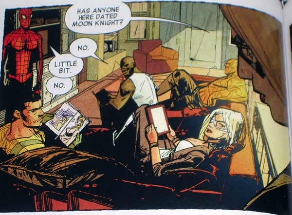 Yes, I love comics for all sorts of reasons, but in the end, it’s the ones that make me laugh that usually get me coming back the most. Bendis’ Moon Knight is good with that. Marc Spector is batshit insane (but he would argue all costumed super heroes are!) and the book’s greatest selling point is the pithy inner dialogue between him and the voices in his head who take on the personalities of Spider-Man, Wolverine, and Captain America. Cap takes on the role of Spector’s moral compass, Spidey is his fun and impulsive side, and Wolverine just mercilessly berates him for everything he does and everything he fails to do. Toss in the self-deprecating humor found in the fact that Moon Knight can get no respect from friends and foes alike, and Moon Knight is dark comedy gold.