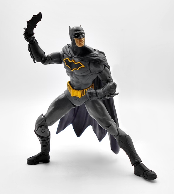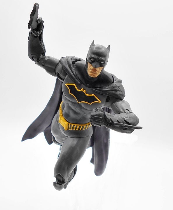 Batman comes with two accessories: His grapple gun and a batarang. His right hand is sculpted to hold either one, while the left is balled up in a fist. The grapple gun is pretty big and satisfying, with the grapple hook sculpted in place. Getting a string to swing the figure on would have been cool, but this looks good in his hand. There’s no obvious trigger, which I assume is part of Warner Brothers weird obsession with not allowing any guns or anything even remotely trigger-y. Quite frankly, I’m surprised McFarlane got away with this accessory at all.