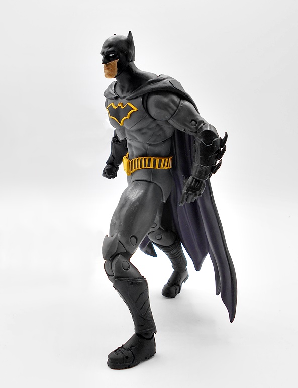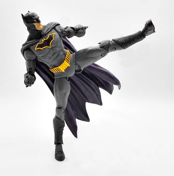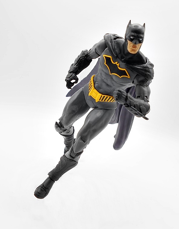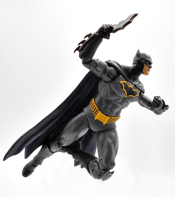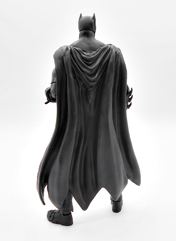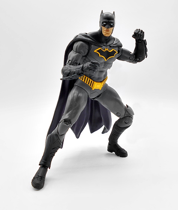 The articulation is exactly what we saw with Beetle and Booster. Eventually, I’ll get to the same point as I did with Marvel Legends and just stop surveying the points of articulation on these. When it doesn’t change from figure to figure, it gets old to recount it all every time. But these bodies are still new to me, so let’s give it a rundown. The arms have rotating hinges in the shoulders, swivels in the biceps, double-hinged elbows, and ball hinges in the wrists. I really have no complaints about the arms at all, and I love how tight the elbows will go! The legs have rotating hinges in the hips, which offer a pretty nice range of motion going forward, back, and to the sides… but so very little swivel, it’s practically non existent.. The knees are double-hinged, the ankles have both hinges and lateral rockers, and the feet are hinged for the toes. The one gripe I’ll keep coming back to in the legs is the lack of a thigh swivel. The neck is ball jointed with some nice range of motion, especially for Batman’s constricting cowls. Finally, you get ball joints under the chest and at the waist, which do a fairly decent job. This is a fun figure to pose and play with, even though the cape can make him a bit back heavy.
