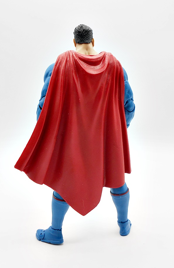 The cape flows out from the front of his shoulders and hangs close to the body. It’s just the right size and heft so as not to throw off his balance or get in the way of articulation.