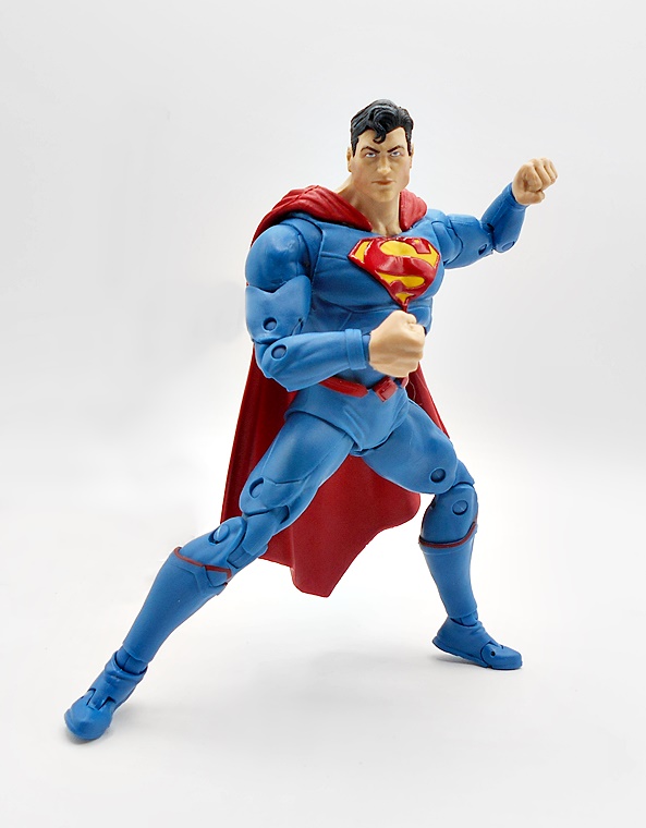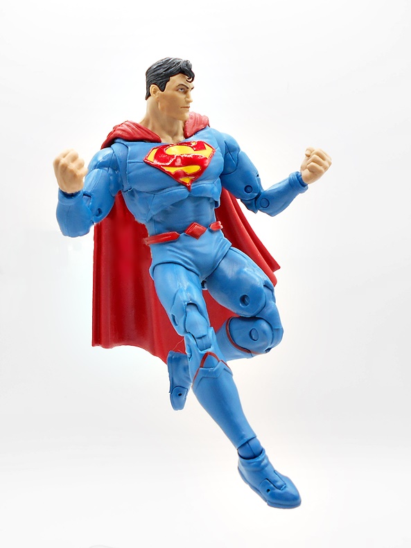 Superman holds no surprises in his articulation. We’ve been getting pretty much the same thing across the board in the Icons series. Here you get rotating hinges in the shoulders and wrists, double hinges in the elbows and knees, ball joints in the hips and neck, swivels in the biceps, and both hinges and lateral rockers in the ankles. There’s an ab crunch hinge in the abdomen and a ball joint just under the chest. Normally, I complain about the lack of thigh swivels, but here I’ll point out that an added hinge in the neck would have been very welcome so Supes could look up when flying.