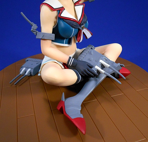 Of course, this “Moon Viewing” version is the equivalent of Taito’s “Day Off” figures, so Akizuki is not wearing her armaments. She does, however still have her arming mount belt around her waist where her weapons would attach if she were out on a mission. On the other hand, she does still have her rudder boots. While her sisters boots were all red, Akizuki’s are mostly gray with red platforms and rudders.