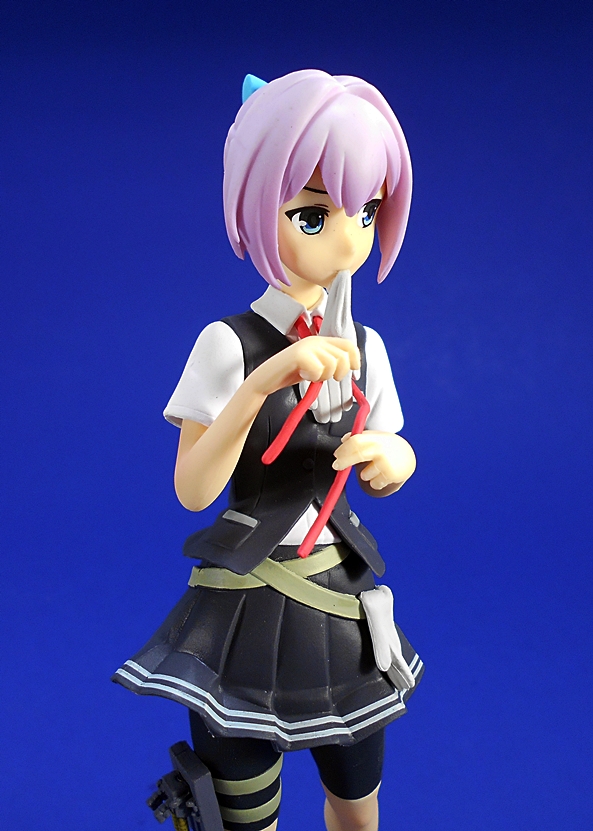 The portrait is excellent. Akizuki is the older of the two sisters, and I think that’s reflected, as her eyes are not as wide as Teruzuki’s. I really like the depth to her hair and how it frames her face. Like her sister, she has a headband that reads “61” in Japanese, indicating that she is part of the 61st Destroyer Division. And as mentioned earlier, she wears her AA Fire Detector above her ahoge. The Susuki Grass does have a habit of slipping out of her left hand, something I noticed as I was handling her a lot, but it snaps back into place easily.