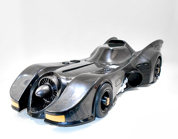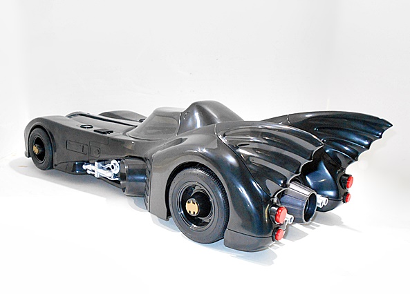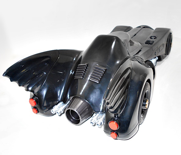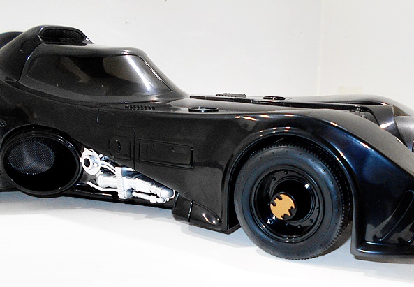 The rear of the car has a central turbine in gunmetal gray with two pairs of silver exhaust pipes and two sets of red taillights. The organic curves of the fins look great, as does the sculpted vents positioned between them. The tires are made of rubber and have gold bat symbols on the wheels, and you get some silver pipes and detail on the side cutouts, as well as circular vents angled away from the rear wheels.