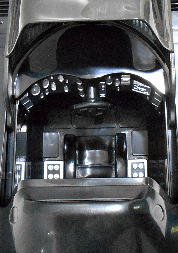 To open the canopy, there’s a button just in front of it on the hood. It releases the catch and allows you to slide the canopy forward to reveal the driver cabin. There’s only one seat and while it isn’t accurate, it works fine for this toy. I’m extremely happy with the level of detail in here. You get a fully sculpted seat, which even has some sculpted stitching on the cushions. The banks of instruments and gauges are all picked out with silver paint and it all looks really sharp. The steering wheel is positioned dead center, but does not turn. Let’s switch over to have a look at Unmasked Batman and then we’ll get him in the Batmobile!