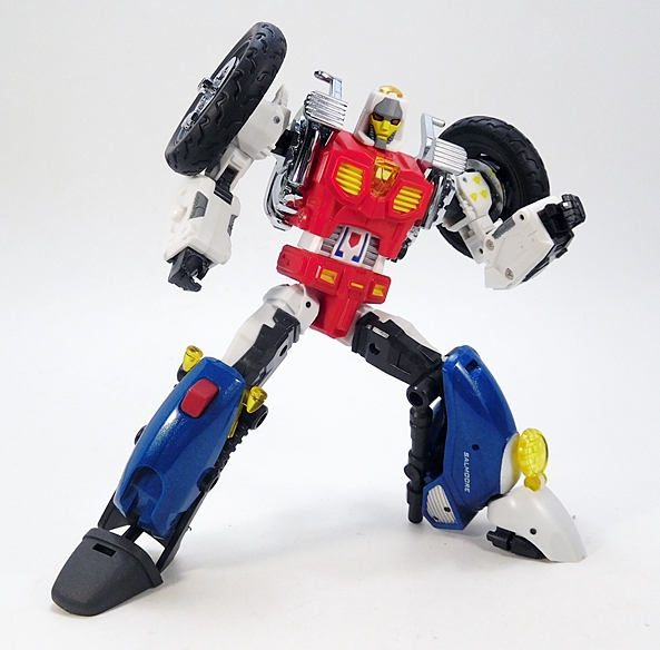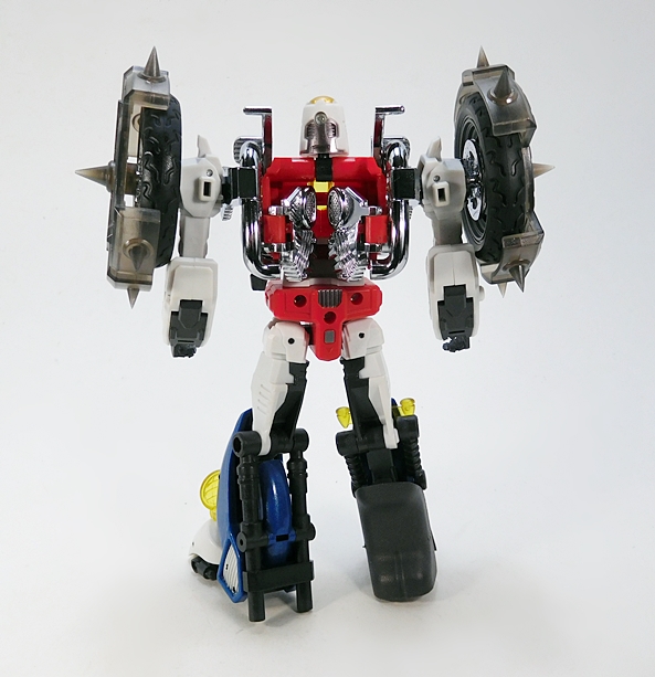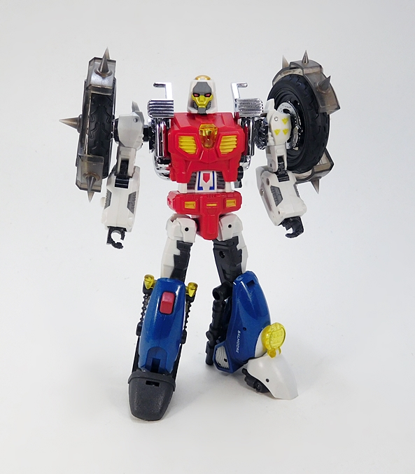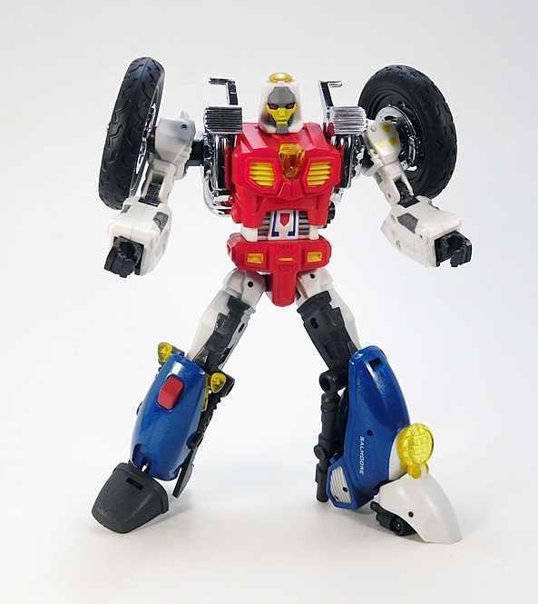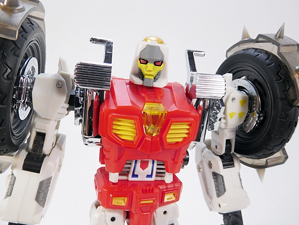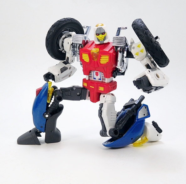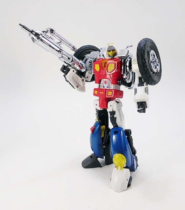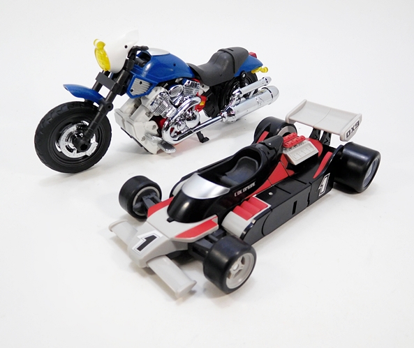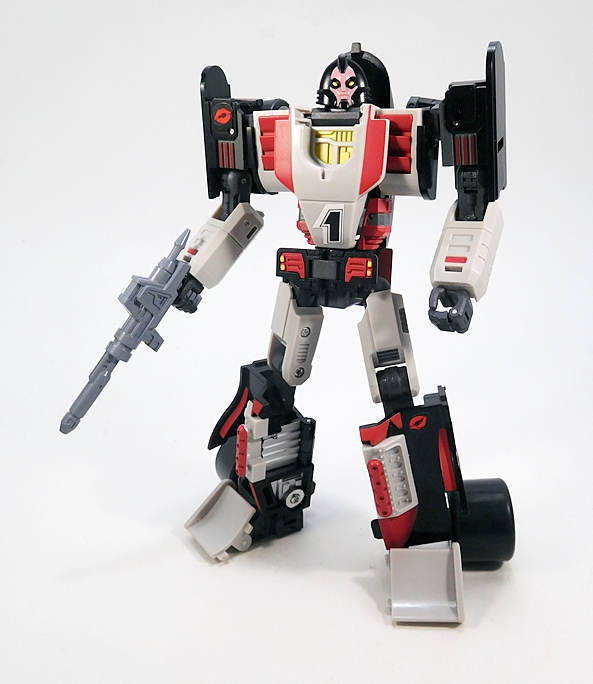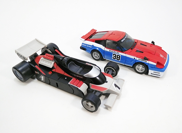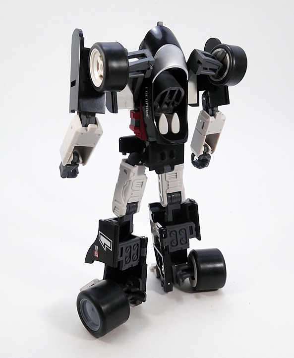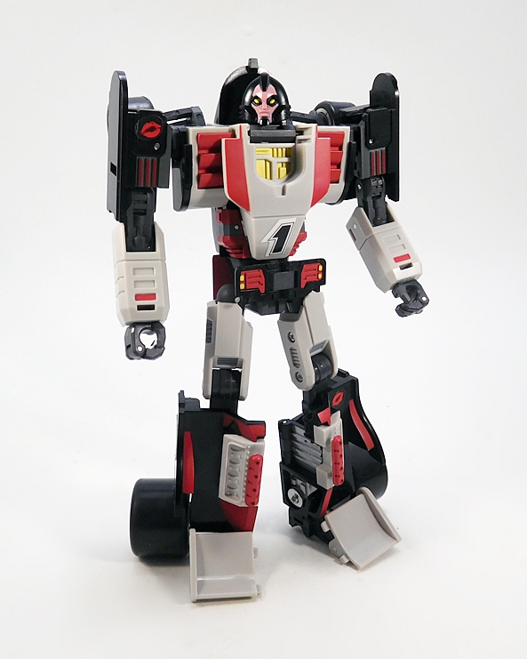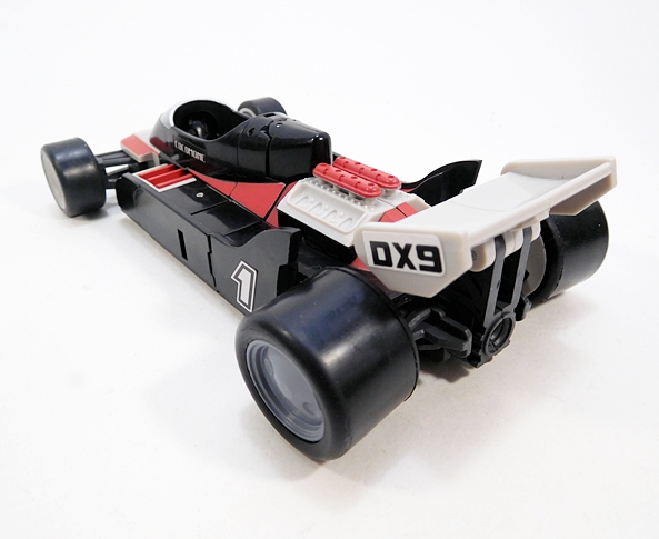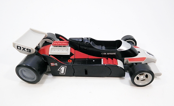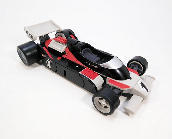 Cocomone is an Formula-1 style racer and Go-Bots purists will no doubt notice that this is not Crasher’s original alt mode. I don’t know a lot about these kinds of racecars, but a little research suggests that she was originally a Porsche 956, or at least that’s what her toy looked like. Obviously, DX9 wanted to make the Mirage release a priority here. Still, the coloring and the fact that they’re both high performance racecars helps sell it to me. As does the fact that I’m not about to get all uppity and upend any tables over a Go-Bot’s alt mode. This mode lock together pretty well, although I tend to have problems with the alignment of the rear tires on mine, as they don’t roll smoothly. The bulk of the sculpted detail here lies in the exposed engine behind the driver’s seat. So, all in all, simple and elegant.
