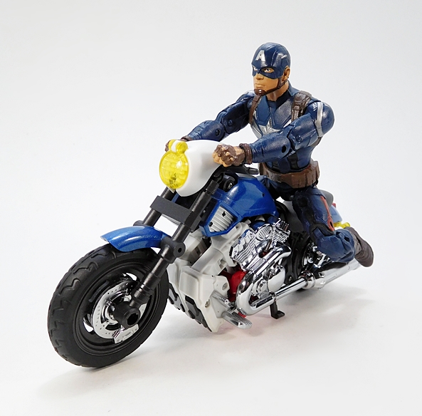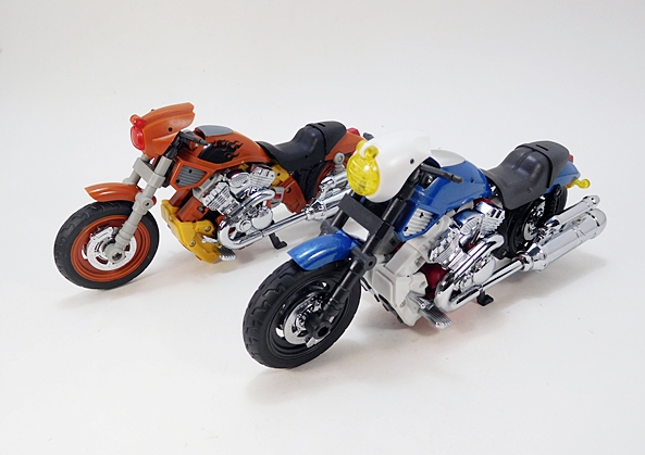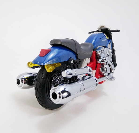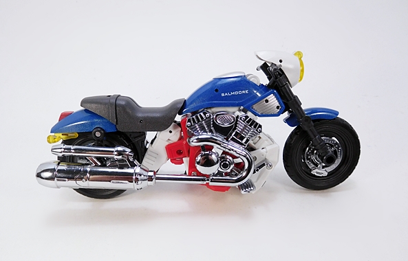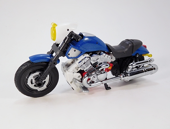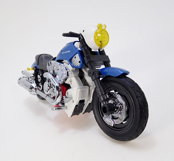 Other than Salmoore, I have no Go-Bots to compare her to, so I wanted to see how she staks (Get it? Staks? That’s a Go-Bot, folks!) up to an MP Transformer. So there’s a picture of her with Smokescreen. They scale pretty well, and that’s to be expected since we know this mold was also used for their Not-MP Mirage. She doesn’t scale as well with Salmoore in alt mode, but that’s also to be expected because sadly mass shifting doesn’t exist and so you need a big motorcycle mode to create a robot that’s in scale with the others. As for the transformation, I feel it features just the right level of complexity, and it goes fairly smoothly. There aren’t any scary clearances like on Salmoore, and I was actually able to get Cocomone transformed without consulting the instructions at all.