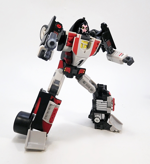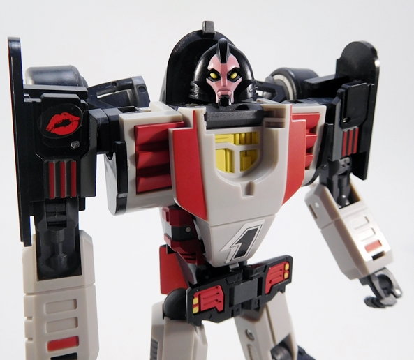 The deco consists entirely of black, gray, and red, and a lot of that is the color of the plastic as opposed to paint. You do, however, get some nice silver paint on the front edge of the driver compartment. The colors are attractive, and the overall result is an aesthetic that lends itself to more of a simple animated style than a realistic one. That works for me. DX9 also included stickers to help spruce things up. They’re OK, but not great, and sadly they don’t include anything for the face of the spoiler. They do include a pair of lipstick graphics, which at least speak to her being a femme-bot. I do wish some of them, like the “1” for the front of the car was cut closer or had a background that matched the gray plastic.