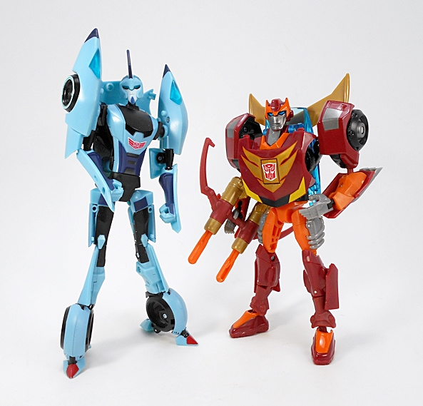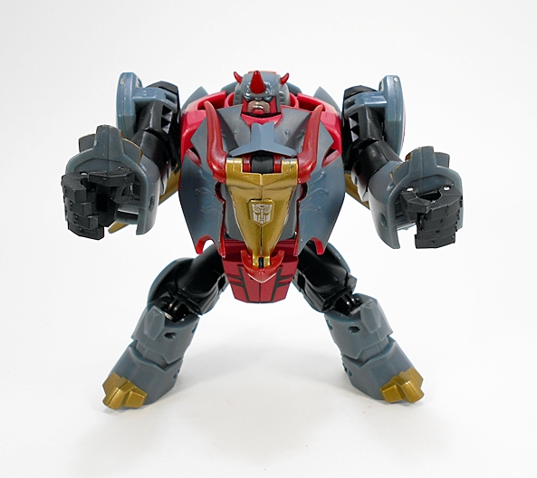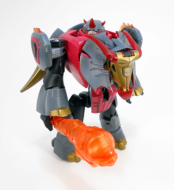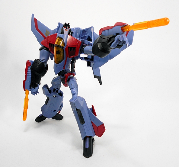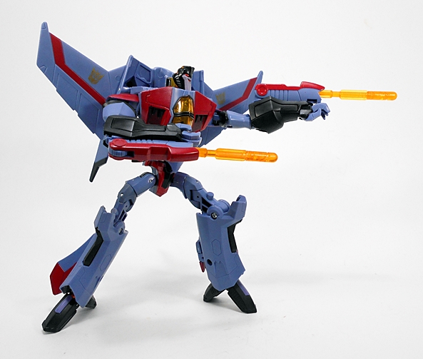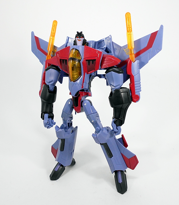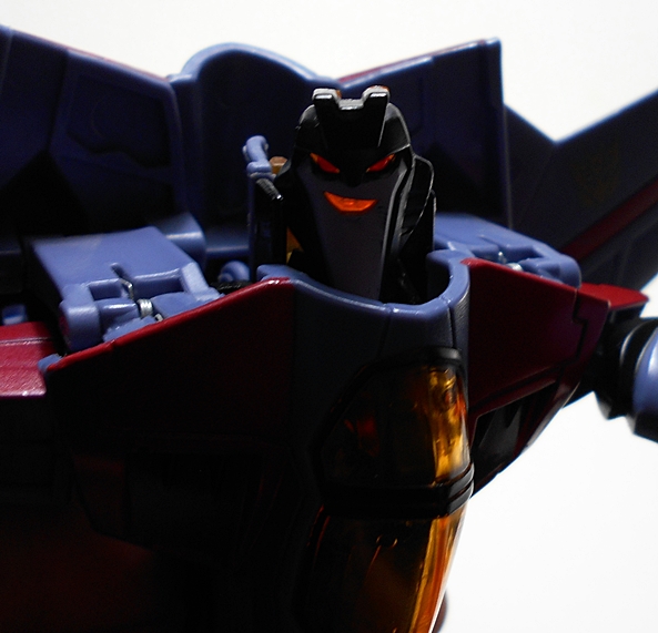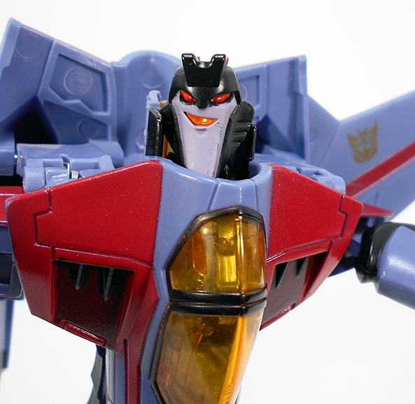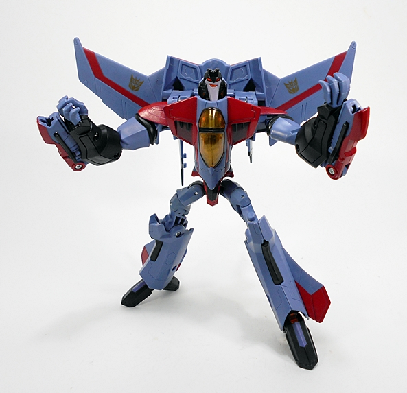 The end result, however, is pretty sweet and despite the stylized design, it doesn’t stray far from the Starscream we all know and love. Tail fins on the legs? Check! Weapons on the arms? Check! Angled shoulder wings? Gotcha! Cockpit dead center? Yup! About the only thing he’s missing is the shoulder intakes, and they look pretty good on his chest.