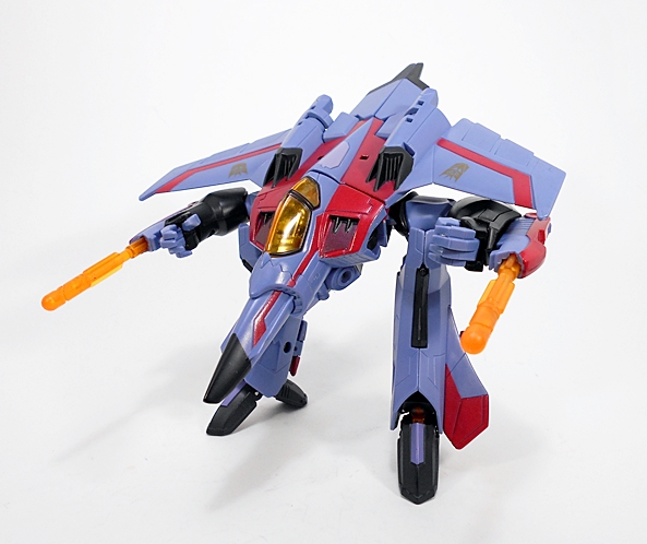 And while it’s not an official third mode, I have to say that Starscream has a killer Gerwalk Mode. It does, however, take some finesse to hold it together. Transforming him all the way into robot mode features some clever stuff, like the nosecone collapsing in to assist in the head reveal. The rest is more or less what we’ve seen before. The real bugger of this figure, however, are all the bits that fall off of him during transformation. The hinged fingers like to pop out, I’ve head the head pop off, and it’s a good idea to unload those missile launchers first because those babies have some hair triggers and can shoot pretty far.