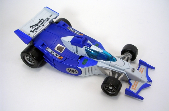 While the sculpt is certainly detailed enough, it’s all the paint and tampos that make this car really shine in my eyes. Mirage is sporting his familiar racing number “26” on the front and sides as well as other markings like, “F.P. Racing” and the lovely “Whitwicky Sparkplugs” on the spoiler. The blue and white deco looks great and there’s a little silver paint thrown in on the front axle and suspension. And you also get that rub sign with the retro goodness baked right in.