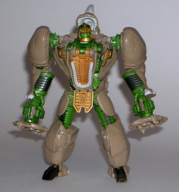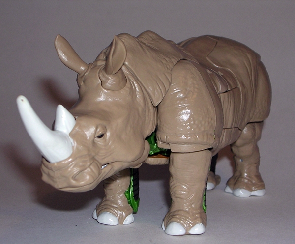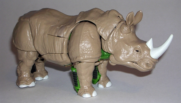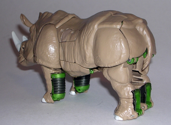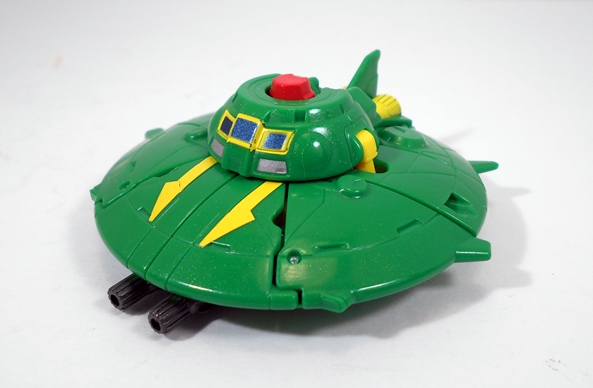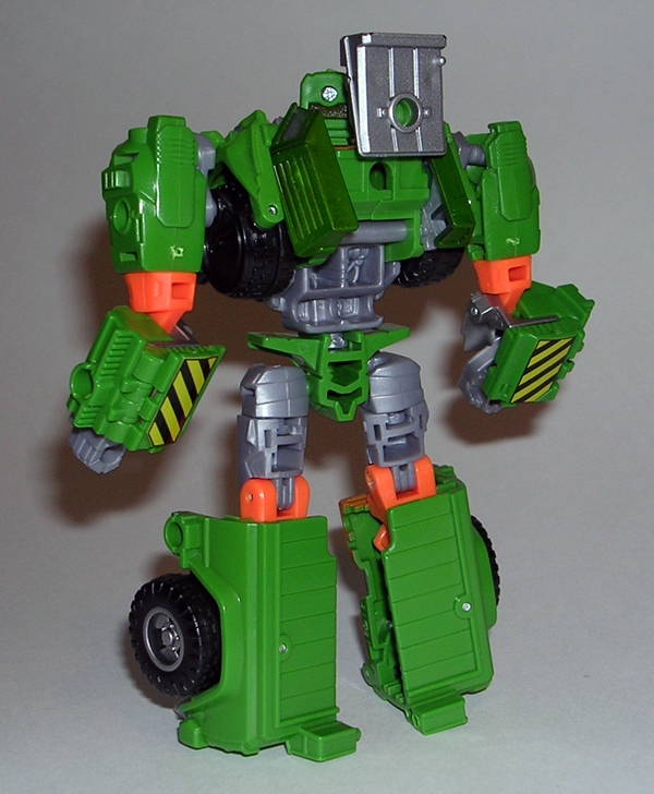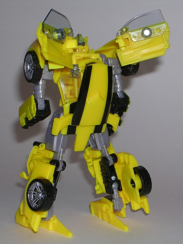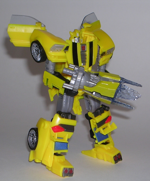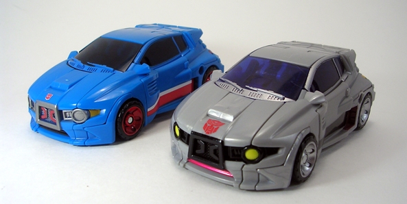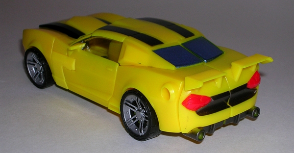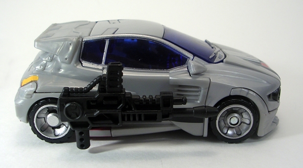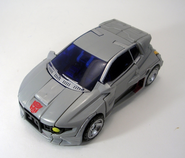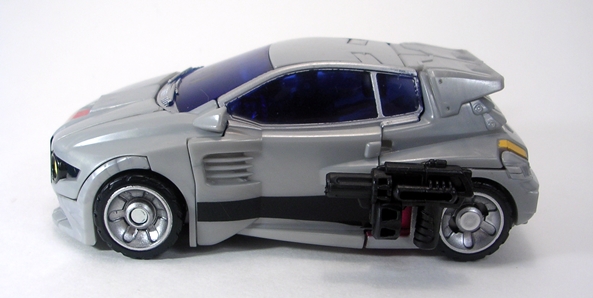 Moving on to transformation… are you familiar with the term “shellformer?” Hmmm? Sure you are! And that term is certainly applicable here. Now, you’ve got your shelformers that involve a whole lot of plates fitting together just right like a car-bag around a bundle of robot kibble. To me, those are the worst offenders. Arcee isn’t that bad, although she does basically wear her alt mode on her back. It folds out to form the car shell and the arms and legs fold in underneath. Normally I’d be pretty critical of this sort of thing, but lets not forget that Arcee is a toy based on a totally made up animation model and one that had to retain a certain femininity in robot mode. That’s a tall order for the engineering department and a $15 toy, and so I’ll be cutting Arcee some slack here.