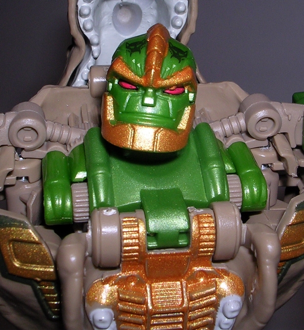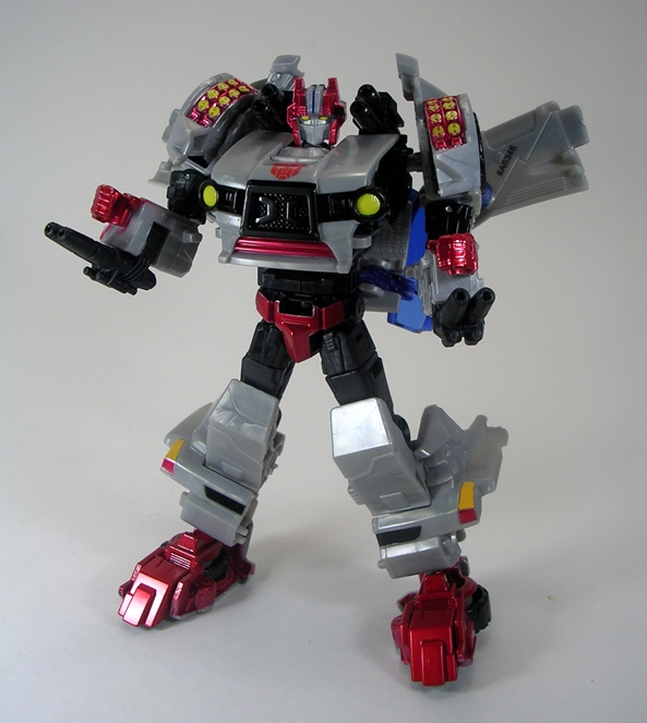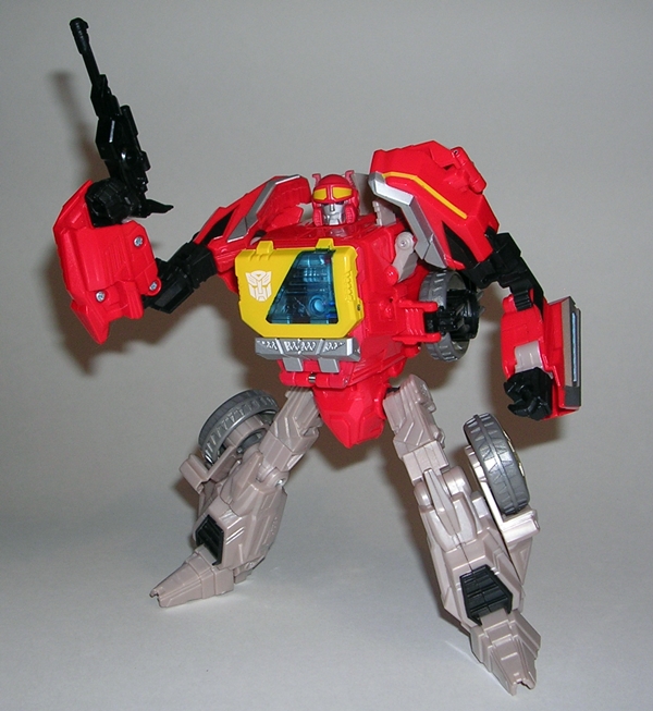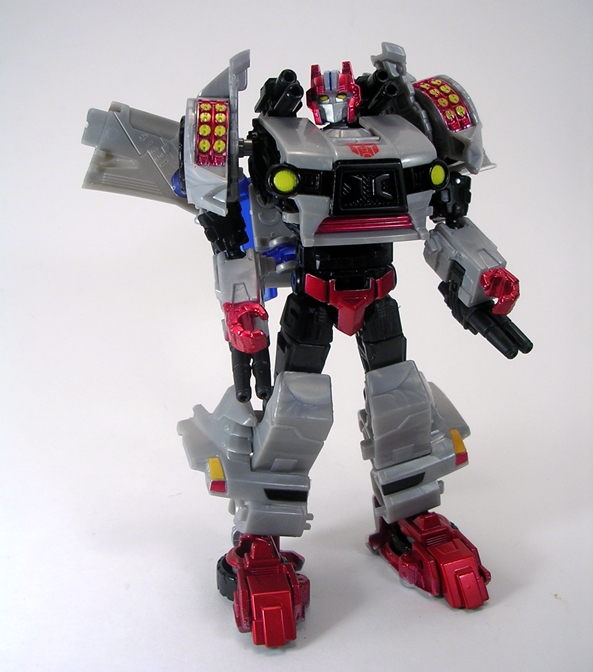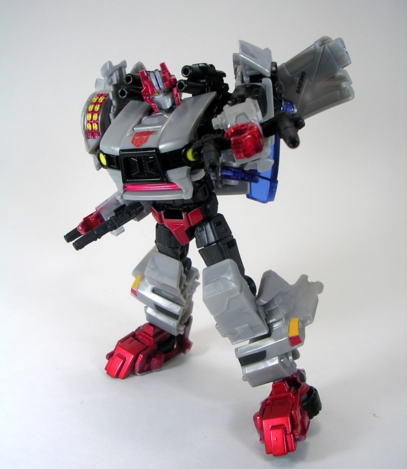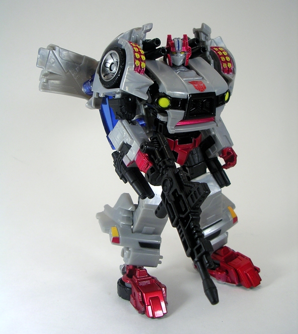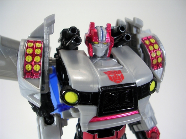 Yes, that my friends is the G1 Arcee I know and love and looking at the feminine curves of her body, it’s easy to see why they had to go the shellformer root and why she wears the car on her back. Still, the way the figure is designed it really does look like Arcee wearing a backpack and I’m very much fine with that. The proportions are pretty good, although Arcee is definitely sporting some child bearing hips she still manages to have a slender waist, a curvy (almost organic looking) midriff, and a strategically placed angle in her chest plate to form them robot ta-ta’s. What’s impressive is that even with that bulky backpack, Arcee has no troubles with balance. The coloring here is more of the same, appropriately white and pink with a little blue and black trim to make things interesting.