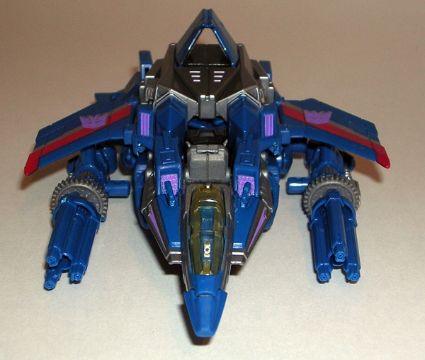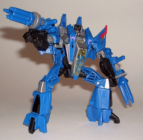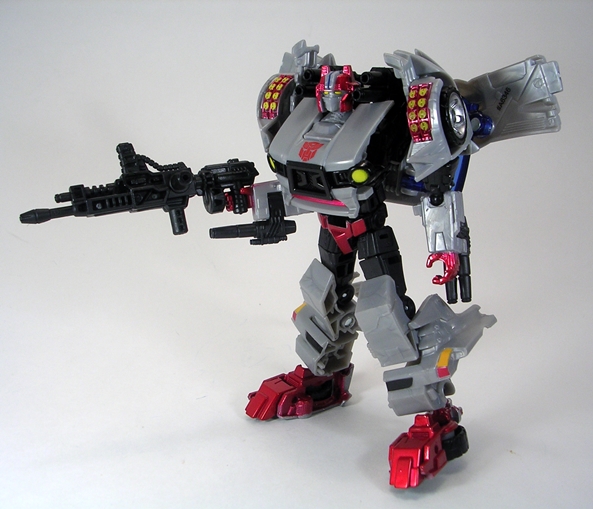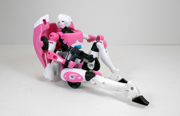 I don’t always bother running down all the articulation points in my Transformers, but in the case of Arcee it’s so damn impressive that I’m going to make an exception. Her arms are ball jointed at the shoulders, hinged at the elbows, and have swivels at the biceps. The legs are ball jointed at the hips, hinged at the knees and ankles, and have swivels in the thighs. There’s no articulation in the waist, but the neck is ball jointed. So Arcee isn’t loaded with a ton of points of articulation, but it’s what you can do with them that count. The joints have a great range of motion and they’re all firm and can hold poses really well.