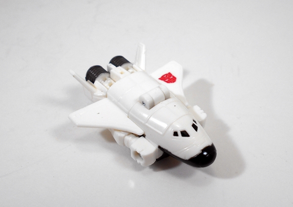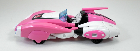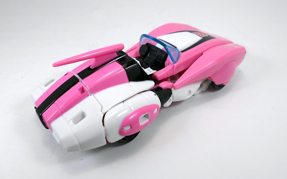 And that alt mode is indeed a pink, white, and black Cybertronian convertible, and I’ll be damned if it ain’t great looking. The long, stylized hood is a little reminiscent of a 70’s Chevy Corvette and I love the fin protruding up from behind the seats. The driver area is pretty nicely detailed with a sculpted steering wheel and console and a translucent blue windshield. The coloring is excellent and that big, crisp Autobot emblem on her hood is pure love. All in all this is a pretty faithful recreation of Arcee’s Sunbow alt mode design. I can’t think of anything off hand that I would have improved on. Even the seaming on it isn’t bad so long as you take the time to make everything go where it’s supposed to.