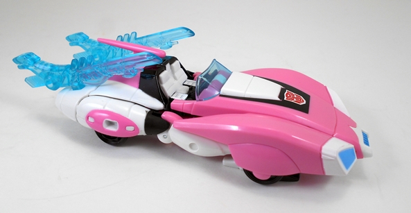 Arcee comes with a plethora of weapons, I’ll look at those more closely in a bit, but all of the weapons can be attached to her car mode in one way or another. Her pink gone can clip under the back of the car plus there are two tabbing ports on the top near the trunk and two more on the sides. As is often the case, weaponinzing the alt mode can get a bit silly, but I must admit to being rather fond of just having the single cannon mounted above one of her rear wheels. It actually look like it’s designed to go there and not like a tacked on afterthought.